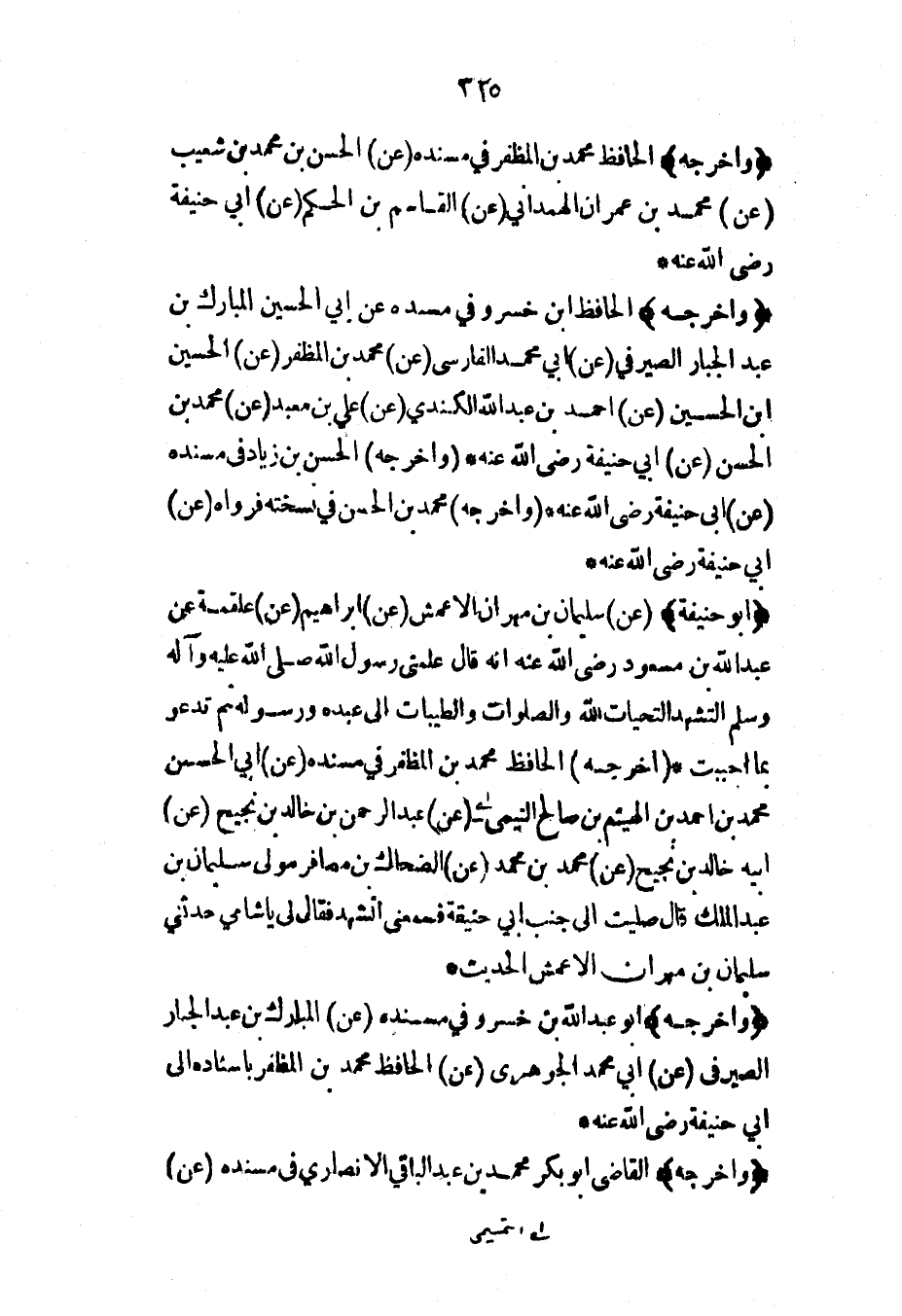 (أبو حنيفة) (عن) سليمان بن مهران الأعمش (عن) إبراهيم (عن) علقمة عن عبد الله بن مسعود رضي الله عنه أنه قال علمني رسول الله صلى الله عليه وآله وسلم التشهد التحيات لله والصلوات والطيبات إلى عبده ورسوله ثم تدعو بما أحببت* (أخرجه) الحافظ محمد بن المظفر في مسنده (عن) أبي الحسن محمد بن أحمد بن الهيثم بن صالح التيمي (عن) عبد الرحمن بن خالد بن نجيح (عن) أبيه خالد بن نجيح (عن) محمد بن محمد (عن) الضحاك بن مسافر مولى سليمان بن عبد الملك قال صليت إلى جنب أبي حنيفة فسمعني أتشهد فقال لي يا شامي حدثني سليمان بن مهران الأعمش الحديث*