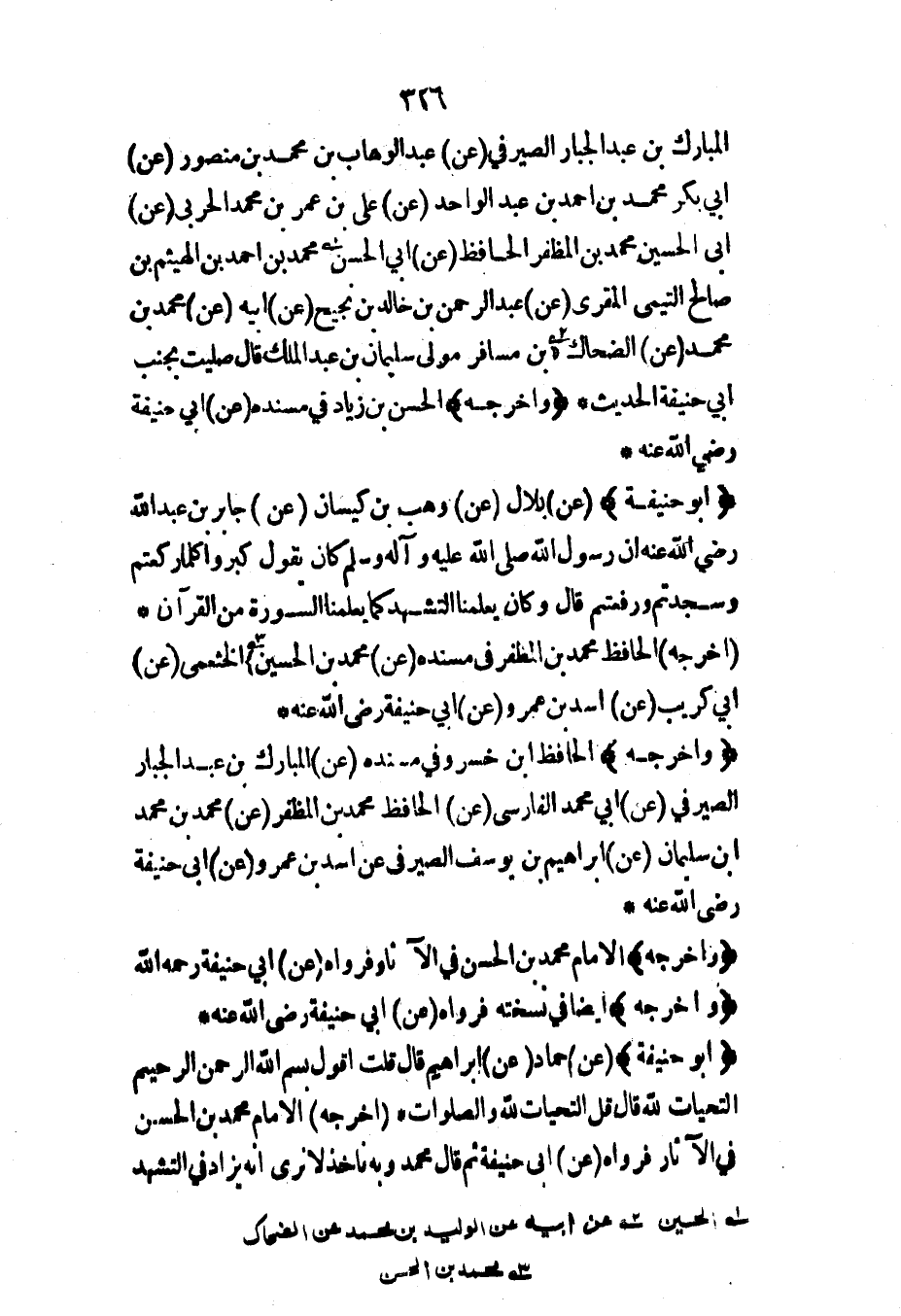 المبارك بن عبد الجبار الصيرفي (عن) عبد الوهاب بن محمد بن منصور (عن) أبي بكر محمد بن أحمد بن عبد الواحد (عن) علي بن عمر بن محمد الحربي (عن) أبي الحسين محمد بن المظفر الحافظ (عن) أبي الحسن محمد بن أحمد بن الهيثم بن صالح التيمي المقري (عن) عبد الرحمن بن خالد بن نجيح (عن) أبيه (عن) محمد بن محمد (عن) الضحاك بن مسافر مولى سليمان بن عبد الملك قال صليت بجنب أبي حنيفة الحديث* (وأخرجه) الحسن بن زياد في مسنده (عن) أبي حنيفة رضي الله عنه*