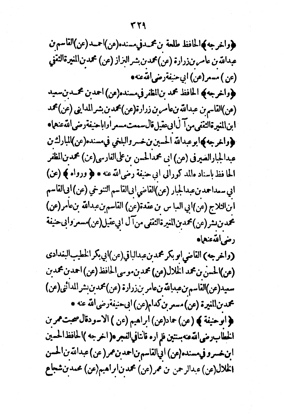 (وأخرجه) الحافظ محمد بن المظفر في مسنده (عن) أحمد بن محمد بن سعيد (عن) القاسم بن عبد الله بن عامر بن زرارة (عن) محمد بن بشر المدايني (عن) محمد ابن المغيرة الثقفي من آل أبي عقيل قال سمعت مسعراً وأبا حنيفة رضي الله عنهما* (وأخرجه) أبو عبد الله الحسين بن خسرو البلخي في مسنده (عن) المبارك بن عبد الجبار الصيرفي (عن) أبي محمد الحسن بن علي الفارسي (عن) محمد بن المظفر الحافظ بإسناده المذكور إلى أبي حنيفة رضي الله عنه* (ورواه) (عن) أبي سعد أحمد بن عبد الجبار (عن) القاضي أبي القاسم التنوخي (عن) أبي القاسم ابن الثلاج (عن) أبي العباس بن عقدة (عن) القاسم بن عبد الله بن عامر (عن) محمد بن بشر (عن) محمد بن المغيرة الثقفي من آل أبي عقيل (عن) مسعر وأبي حنيفة رضي الله عنهما*