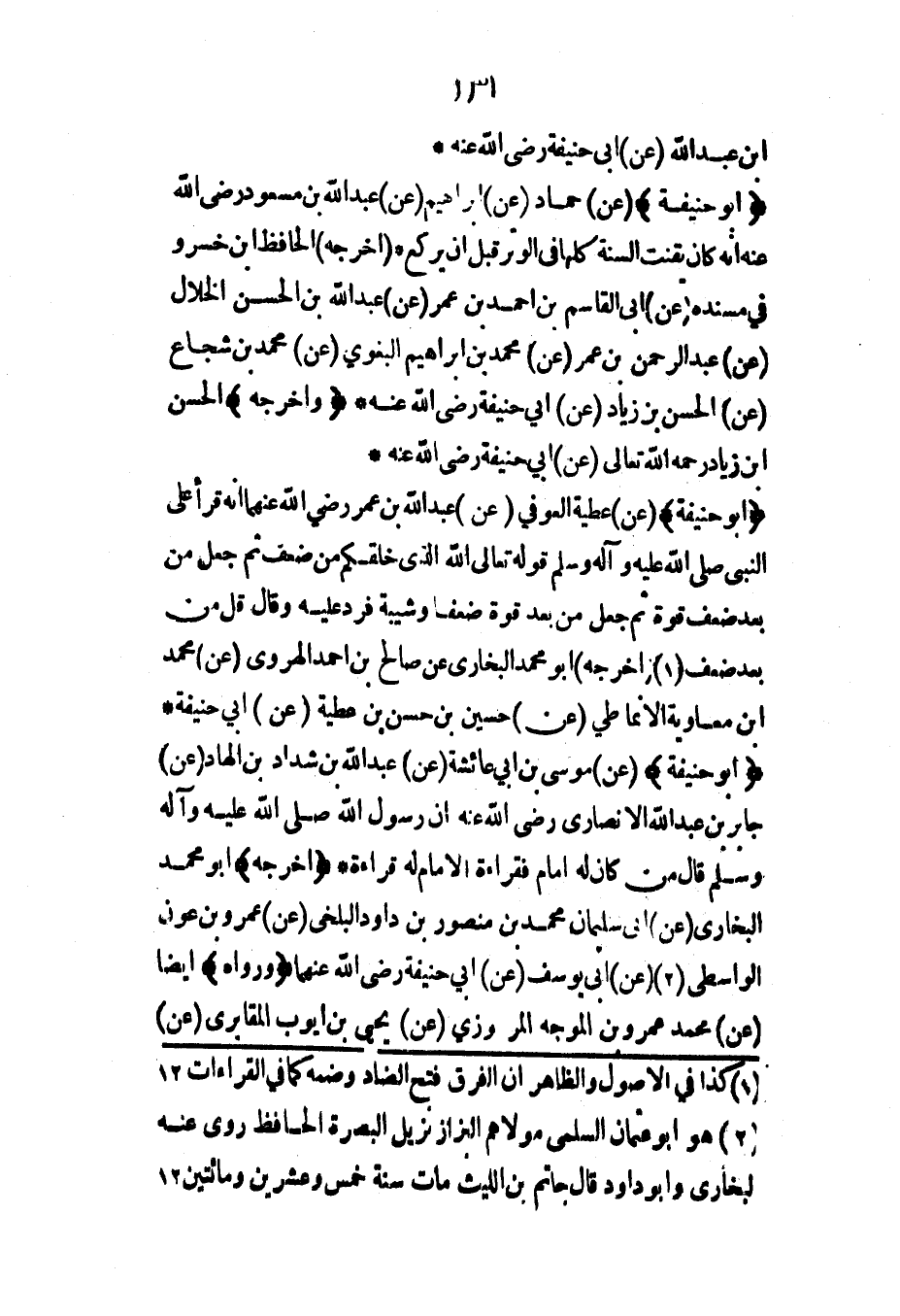 (أبو حنيفة) (عن) موسى بن أبي عائشة (عن) عبد الله بن شداد بن الهاد (عن) جابر بن عبد الله الأنصاري رضي الله عنه أن رسول الله صلى الله عليه وآله وسلم قال من كان له إمام فقراءة الإمام له قراءة* (أخرجه) أبو محمد البخاري (عن) أبي سليمان محمد بن منصور بن داود البلخي (عن) عمرو بن عون الواسطي (عن) أبي يوسف (عن) أبي حنيفة رضي الله عنهما (ورواه) أيضاً (عن) محمد عمرو بن الموجه المروزي (عن) يحيى بن أيوب المقابري (عن)