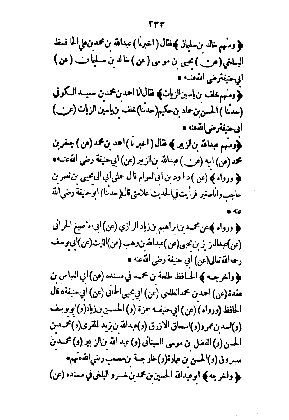 (وأخرجه) الحافظ طلحة بن محمد في مسنده (عن) أبي العباس بن عقدة (عن) أحمد بن محمد الطلحي (عن) أبي يحيى الحماني (عن) أبي حنيفة* قال الحافظ (ورواه) (عن) أبي حنيفة حمزة (و) الحسن بن زياد (و) أبو يوسف (و) أسد بن عمرو (و) إسحاق الأزرق (و) عبد الله بن يزيد المقري (و) محمد بن الحسن (و) الفضل بن موسى السيناني (و) عبد الله بن الزبير (و) محمد بن مسروق (و) الحسن بن عمارة (و) خارجة بن مصعب رضي الله عنهم*