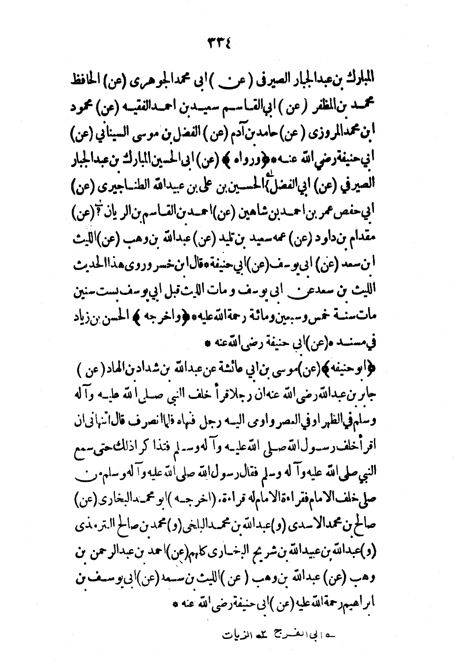 (أبو حنيفة) (عن) موسى بن أبي عائشة عن عبد الله بن شداد بن الهاد (عن) جابر بن عبد الله رضي الله عنه أن رجلاً قرأ خلف النبي صلى الله عليه وآله وسلم في الظهر أو في العصر وأومى إليه رجل فنهاه فلما انصرف قال أتنهاني أن أقرأ خلف رسول الله صلى الله عليه وآله وسلم فتذاكرا ذلك حتى سمع النبي صلى الله عليه وآله وسلم فقال رسول الله صلى الله عليه وآله وسلم من صلى خلف الإمام فقراءة الإمام له قراءة* (أخرجه) أبو محمد البخاري (عن) صالح بن محمد الأسدي (و) عبد الله بن محمد البلخي (و) محمد بن صالح الترمذي (و) عبد الله بن عبيد الله بن شريح البخاري كلهم (عن) أحمد بن عبد الرحمن بن وهب (عن) عبد الله بن وهب (عن) الليث بن سعد (عن) أبي يوسف بن إبراهيم رحمة الله عليه (عن) أبي حنيفة رضي الله عنه*