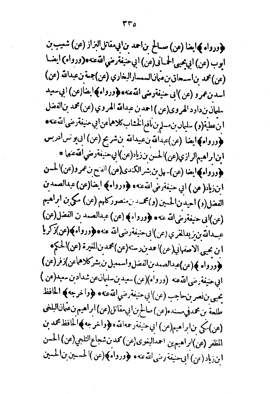 (ورواه) (عن) عبد الصمد بن الفضل وإسماعيل بن بشر كلاهما (عن) زفر (عن) أبي حنيفة رضي الله عنه (ورواه) (عن) سعيد بن سليمان عن شداد بن سعيد (عن) يحيى بن نصر بن حاجب (عن) أبي حنيفة رضي الله عنه* (وأخرجه) الحافظ طلحة بن محمد في مسنده (عن) صالح بن أبي مقاتل (عن) إبراهيم بن عثمان البلخي (عن) مكي بن إبراهيم (عن) أبي حنيفة رحمه الله* (وأخرجه) الحافظ محمد بن المظفر (عن) إبراهيم بن أحمد البغوي (عن) محمد بن شجاع الثلجي (عن) الحسن ابن زياد (عن) أبي حنيفة رضي الله عنه* (ورواه) (عن) الحسين بن الحسين