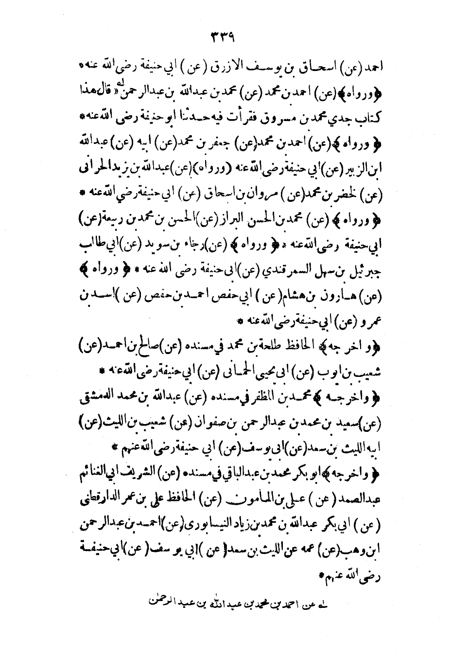 أحمد (عن) إسحاق بن يوسف الأزرق (عن) أبي حنيفة رضي الله عنه* (ورواه) (عن) أحمد بن محمد (عن) محمد بن عبد الله بن عبد الرحمن قال هذا كتاب جدي محمد بن مسروق فقرأت فيه حدثنا أبو حنيفة رضي الله عنه* (ورواه) (عن) أحمد بن محمد (عن) جعفر بن محمد (عن) أبيه (عن) عبد الله ابن الزبير (عن) أبي حنيفة رضي الله عنه (ورواه) (عن) عن عبد الله بن يزيد الحراني (عن) الخضر بن محمد (عن) مروان بن إسحاق (عن) أبي حنيفة رضي الله عنه* (ورواه) (عن) محمد بن الحسن البزاز (عن) الحسن بن محمد بن ربيعة (عن) أبي حنيفة رضي الله عنه* (ورواه) (عن) رجاء بن سويد (عن) أبي طالب جبرئيل بن سهل السمرقندي (عن) أبي حنيفة رضي الله عنه* (ورواه) (عن) هارون بن هشام (عن) أبي حفص أحمد بن حفص (عن) أسد بن عمرو (عن) أبي حنيفة رضي الله عنه*