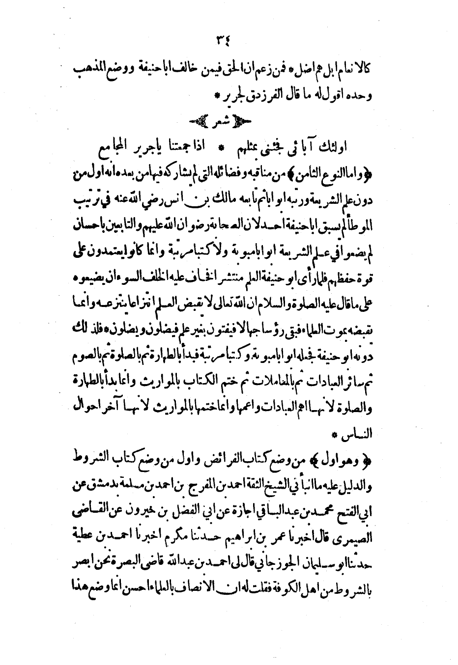 وأما النوع الثامن من مناقبه وفضائله التي لم يشاركه فيها من بعده أنه أول من دون علم الشريعة ورتبه أبواباً ثم تابعه مالك بن أنس رضي الله عنه في ترتيب الموطأ لم يسبق أبا حنيفة أحد لأن الصحابة رضوان الله عليهم والتابعين بإحسان لم يضعوا في علم الشريعة أبواباً مبوبة ولا كتباً مرتبة وإنما كانوا يعتمدون على قوة حفظهم فلما رأى أبو حنيفة العلم منتشراً فخاف عليه الخلف السوء أن يضيعوه على ما قال عليه الصلاة والسلام إن الله تعالى لا يقبض العلم انتزاعاً ينتزعه وإنما يقبضه بموت العلماء فبقي رؤساً جهالاً فيفتون بغير علمٍ فيضلون ويضلون* فلذلك دونه أبو حنيفة فجعله أبواباً مبوبة وكتباً مرتبة فبدأ بالطهارة ثم بالصلاة ثم بالصوم ثم سائر العبادات ثم بالمعاملات ثم ختم الكتاب بالمواريث وإنما بدأ بالطهارة والصلاة لأنها أهم العبادات وأعمها وإنما ختمها بالمواريث لأنها آخر أحوال الناس*