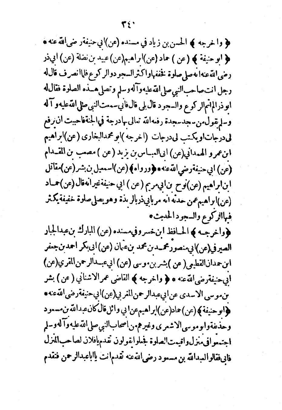 (أبو حنيفة) (عن) حماد (عن) إبراهيم (عن) عبيد بن نضلة (عن) أبي ذر رضي الله عنه أنه صلى صلوة فخففها وأكثر السجود والركوع فلما انصرف قال له رجل أنت صاحب النبي صلى الله عليه وآله وسلم وتصلي هذه الصلاة فقال له أبو ذر لم أتم الركوع والسجود قال بلى قال فإني سمعت النبي صلى الله عليه وآله وسلم يقول من سجد سجدة رفعه الله تعالى بها درجة في الجنة فأحببت أن يرفع لي درجات أو يكتب لي درجات (أخرجه) أبو محمد البخاري (عن) إبراهيم ابن عمرو الهمداني (عن) أبي العباس بن يزيد (عن) مصعب بن المقدام (عن) أبي حنيفة رضي الله عنه* (ورواه) (عن) إسماعيل بن بشر (عن) مقاتل ابن إبراهيم (عن) نوح بن أبي مريم (عن) أبي حنيفة غير أنه قال (عن) حماد (عن) إبراهيم عمن حدثه أنه مر بأبي ذر بالربذة وهو يصلي صلوة خفيفة يكثر فيها الركوع والسجود الحديث*