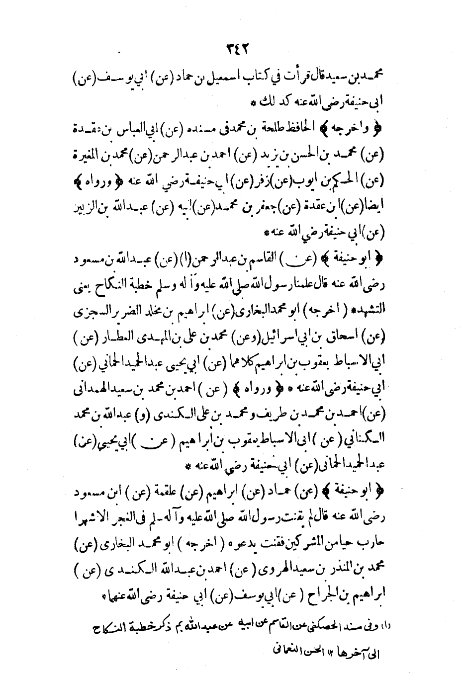 (أبو حنيفة) (عن) القاسم بن عبد الرحمن (عن) عبد الله بن مسعود رضي الله عنه قال علمنا رسول الله صلى الله عليه وآله وسلم خطبة النكاح يعني التشهد* (أخرجه) أبو محمد البخاري (عن) إبراهيم بن مخلد الضرير السجزي (عن) إسحاق بن أبي إسرائيل (وعن) محمد بن علي بن المهدي العطار (عن) أبي الأسباط يعقوب بن إبراهيم كلاهما (عن) أبي يحيى عبد الحميد الحماني (عن) أبي حنيفة رضي الله عنه* (ورواه) (عن) أحمد بن محمد بن سعيد الهمداني (عن) أحمد بن محمد بن طريف ومحمد بن علي الكندي (و) عبد الله بن محمد الكناني (عن) أبي الأسباط يعقوب بن إبراهيم (عن) أبي يحيى (عن) عبد الحميد الحماني (عن) أبي حنيفة رضي الله عنه*