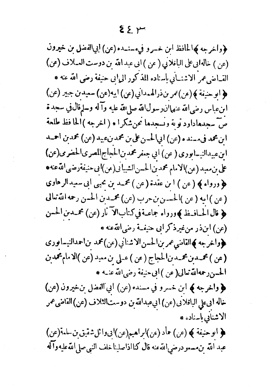 (وأخرجه) القاضي عمر بن الحسن الأشناني (عن) محمد بن أحمد النيسابوري (عن) محمد بن محمد بن الحجاج (عن) علي بن معبد (عن) الإمام محمد بن الحسن رحمه الله تعالى (عن) أبي حنيفة رضي الله عنه*