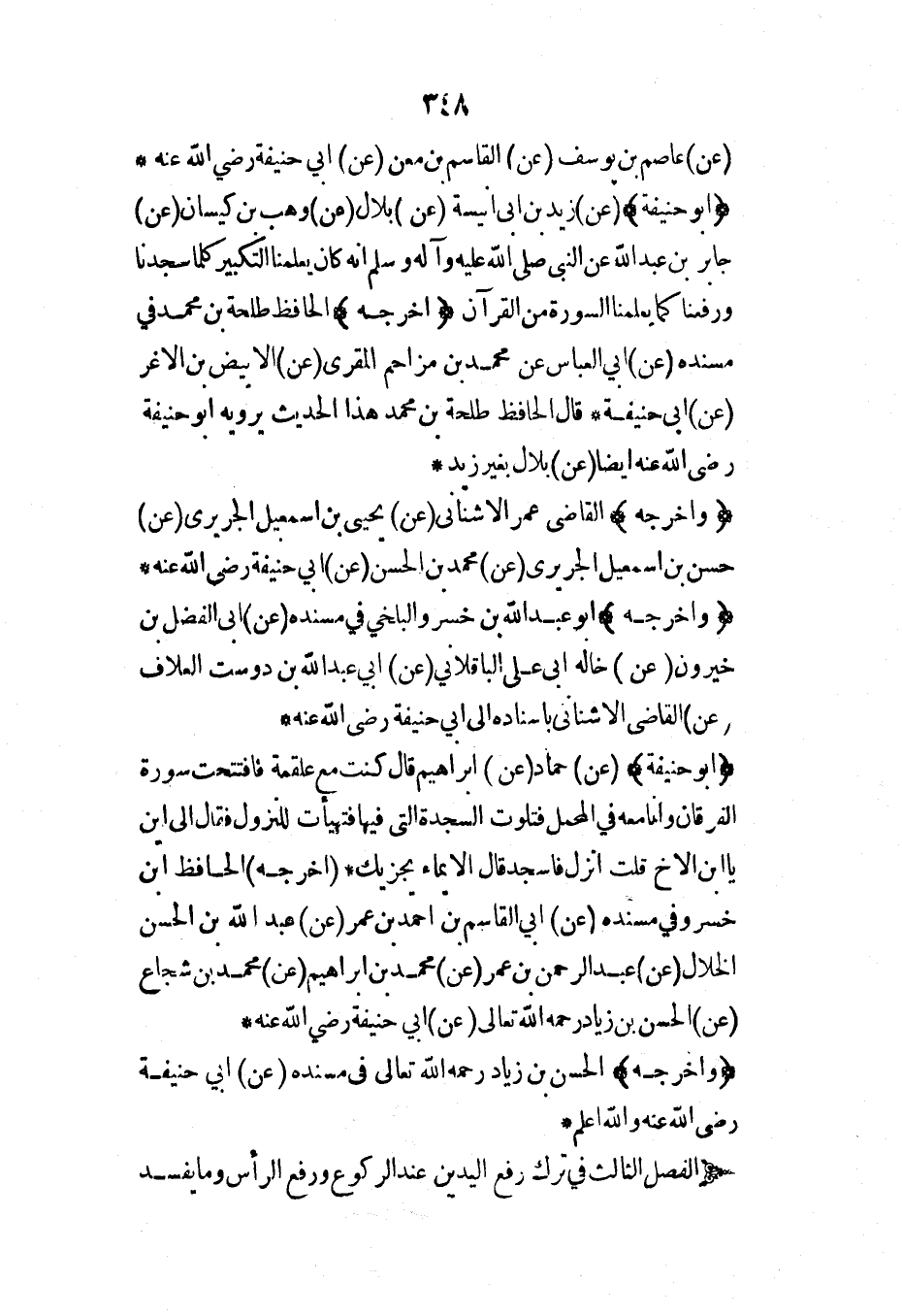 (وأخرجه) القاضي عمر الأشناني (عن) يحيى بن إسماعيل الجريري (عن) حسن بن إسماعيل الجريري (عن) محمد بن الحسن (عن) أبي حنيفة رضي الله عنه* (وأخرجه) أبو عبد الله بن خسرو البلخي في مسنده (عن) أبي الفضل بن خيرون (عن) خاله أبي علي الباقلاني (عن) أبي عبد الله بن دوست العلاف (عن) القاضي الأشناني بإسناده إلى أبي حنيفة رضي الله عنه*