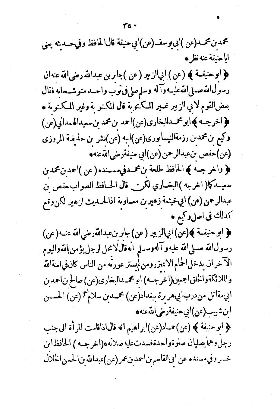 (أبو حنيفة) (عن) أبي الزبير (عن) جابر بن عبد الله رضي الله عنه (عن) رسول الله صلى الله عليه وآله وسلم أنه قال لا يحل لرجل يؤمن بالله واليوم الآخر أن يدخل الحمام إلا بميزر ومن لم يستر عورته من الناس كان في لعنة الله والملائكة والخلق أجمعين (أخرجه) أبو محمد البخاري (عن) صالح بن أحمد بن أبي مقاتل من درب أبي هريرة ببغداد (عن) محمد بن سلام (عن) الحسن ابن شبيب (عن) أبي حنيفة رضي الله عنه*