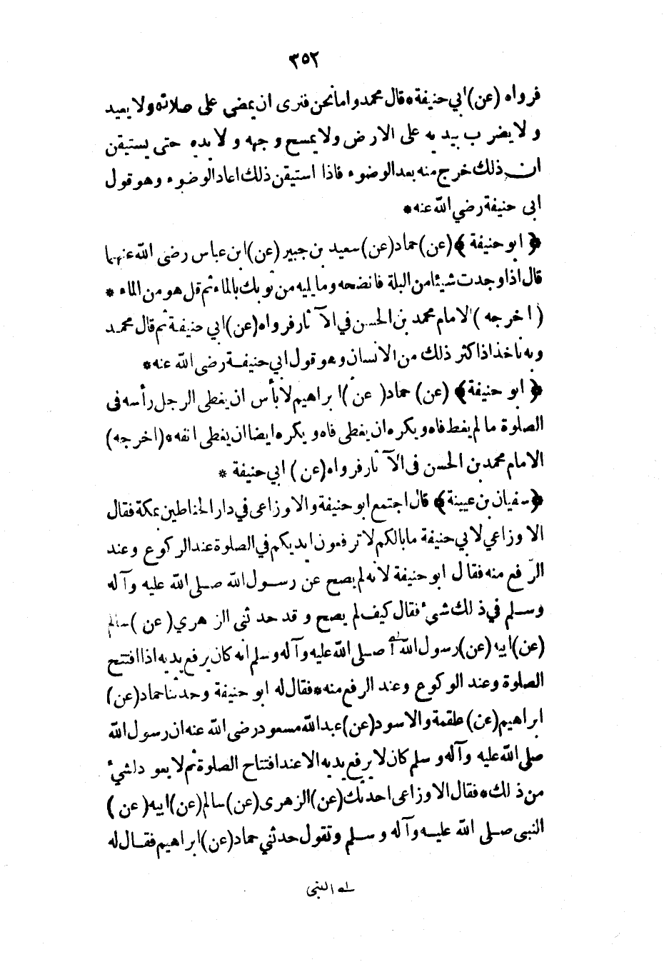 (أبو حنيفة) (عن) حماد (عن) إبراهيم لا بأس أن يغطي الرجل رأسه في الصلاة ما لم يغط فاه ويكره أن يغطي فاه ويكره أيضاً أن يغطي أنفه* (أخرجه) الإمام محمد بن الحسن في الآثار فرواه (عن) أبي حنيفة*