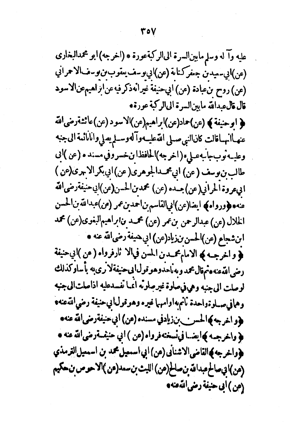 (أبو حنيفة) (عن) حماد (عن) إبراهيم (عن) الأسود (عن) عائشة رضي الله عنها أنها قالت كان النبي صلى الله عليه وآله وسلم يصلي وأنا نائمة إلى جنبه وعليه ثوب جانبه علي* (أخرجه) الحافظ ابن خسرو في مسنده (عن) أبي طالب بن يوسف (عن) أبي محمد الجوهري (عن) أبي بكر الأبهري (عن) أبي عروة الحراني (عن) جده (عن) محمد بن الحسن (عن) أبي حنيفة رضي الله عنه* (ورواه) أيضاً (عن) أبي القاسم بن أحمد بن عمر (عن) عبد الله بن الحسن الخلال (عن) عبد الرحمن بن عمر (عن) محمد بن إبراهيم البغوي (عن) محمد ابن شجاع (عن) الحسن بن زياد (عن) أبي حنيفة رضي الله عنه*