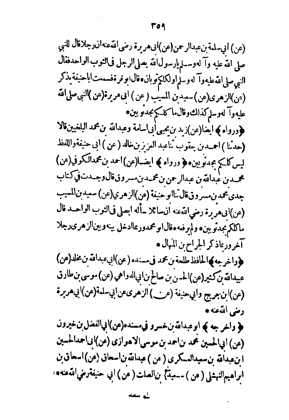 (ورواه) أيضاً (عن) زيد بن يحيى أبي أسامة وعبد الله بن محمد البلخيين قالا (حدثنا) أحمد بن يعقوب ثنا عبد العزيز بن خالد (عن) أبي حنيفة واللفظ ليس كلكم يجد ثوبين* (ورواه) أيضاً (عن) أحمد بن محمد الكوفي (عن) محمد بن عبد الله بن عبد الرحمن بن محمد بن مسروق قال وجدت في كتاب جدي محمد بن مسروق قال ثنا أبو حنيفة (عن) الزهري (عن) سعيد بن المسيب (عن) أبي هريرة رضي الله عنه أن سائلاً سأله أيصلى في الثوب الواحد قال ما كلكم يجد ثوبين* ولم يرفعه* قال أبو محمد وربما أدخل بينه وبين الزهري رجلاً آخر وربما ذكر الجراح بن المنهال*