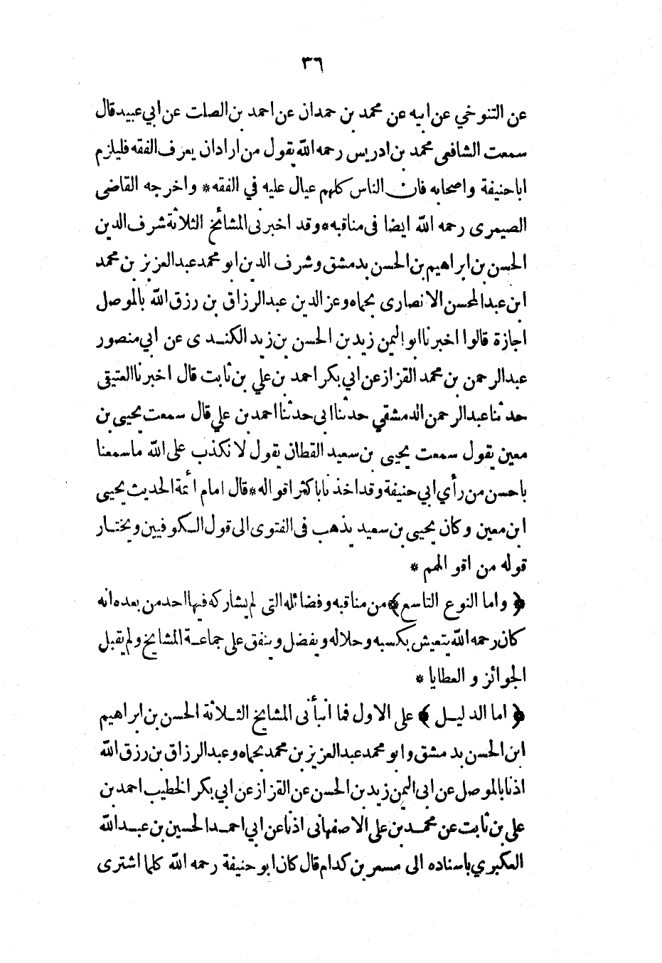 (أما الدليل) على الأول فما أنبأني المشايخ الثلاثة الحسن بن إبراهيم ابن الحسن بدمشق وأبو محمد عبد العزيز بن محمد بحماه وعبد الرزاق بن رزق الله إذناً بالموصل عن أبي اليمن زيد بن الحسن عن القزاز عن أبي بكر الخطيب أحمد بن علي بن ثابت عن محمد بن علي الأصفهاني إذناً عن أبي أحمد الحسين بن عبد الله العكبري بإسناده إلى مسعر بن كدام قال كان أبو حنيفة رحمه الله كلما اشترى