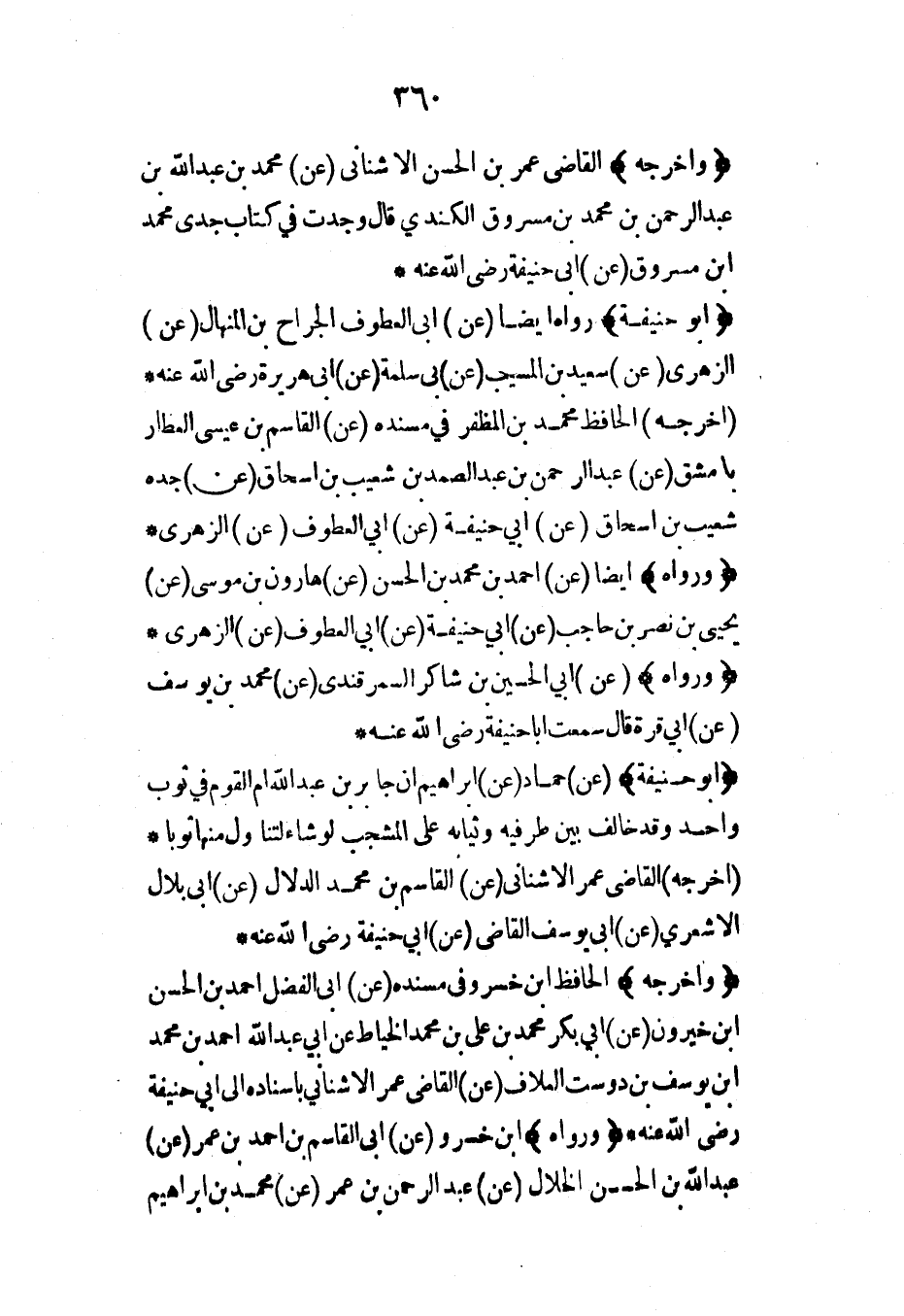 (أبو حنيفة) (عن) حماد (عن) إبراهيم أن جابر بن عبد الله أم القوم في ثوب واحد وقد خالف بين طرفيه وثيابه على المشجب لو شاء لتناول منها ثوباً* (أخرجه) القاضي عمر الأشناني (عن) القاسم بن محمد الدلال (عن) أبي بلال الأشعري (عن) أبي يوسف القاضي (عن) أبي حنيفة رضي الله عنه*