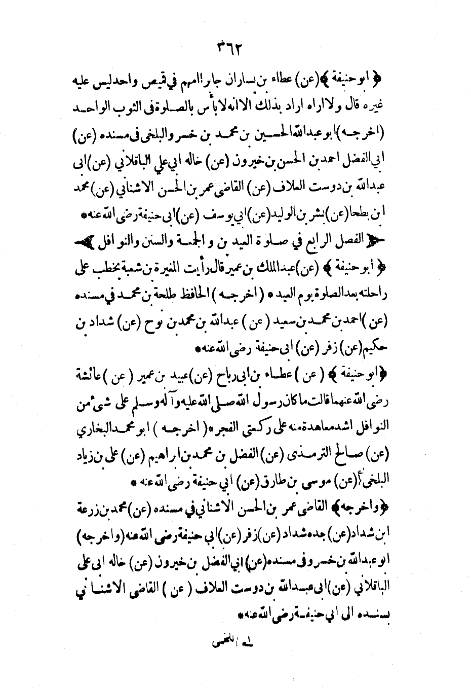 (أبو حنيفة) (عن) عبد الملك بن عمير قال رأيت المغيرة بن شعبة يخطب على راحلته بعد الصلاة يوم العيد* (أخرجه) الحافظ طلحة بن محمد في مسنده (عن) أحمد بن محمد بن سعيد (عن) عبد الله بن محمد بن نوح (عن) شداد بن حكيم (عن) زفر (عن) أبي حنيفة رضي الله عنه*