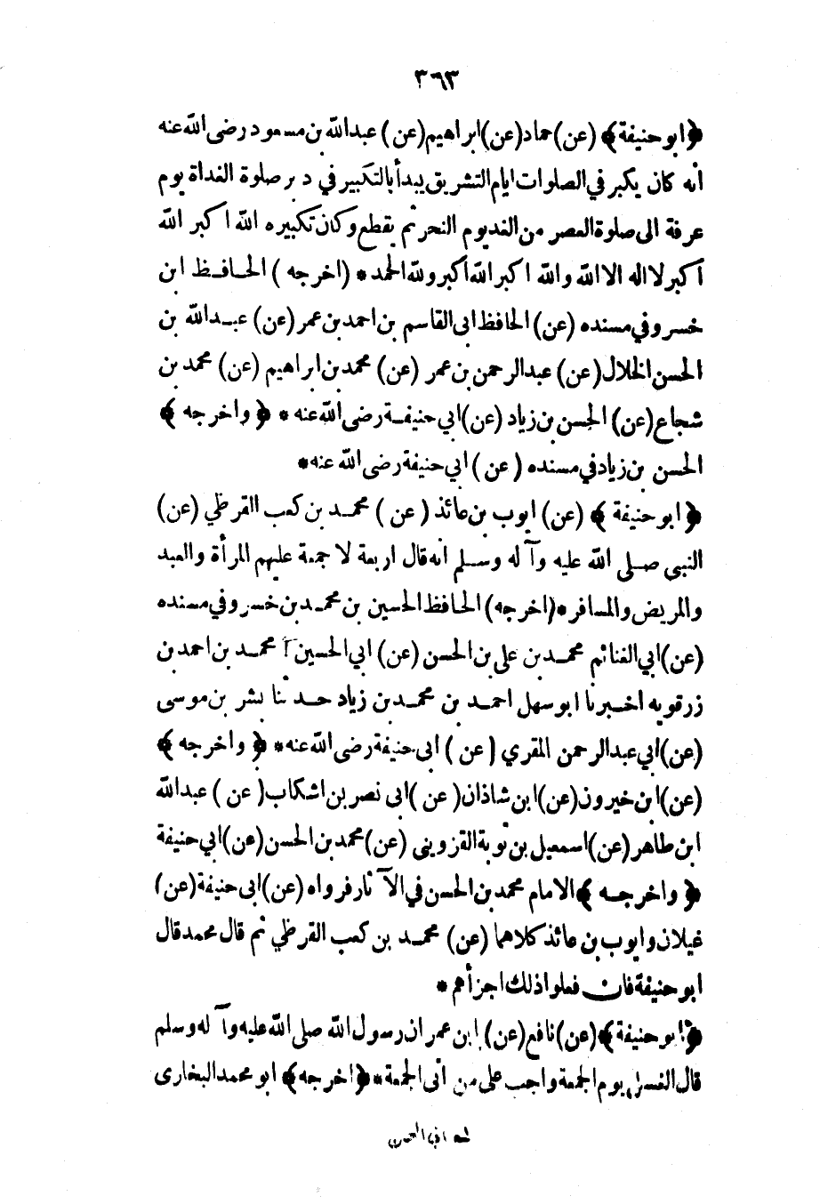 (أبو حنيفة) (عن) حماد (عن) إبراهيم (عن) عبد الله بن مسعود رضي الله عنه أنه كان يكبر في الصلوات أيام التشريق يبدأ بالتكبير في دبر صلوة الغداة يوم عرفة إلى صلوة العصر من الغد يوم النحر ثم يقطع وكان تكبيره الله أكبر الله أكبر لا إله إلا الله والله أكبر الله أكبر ولله الحمد* (أخرجه) الحافظ ابن خسرو في مسنده (عن) الحافظ أبي القاسم بن أحمد بن عمر (عن) عبد الله بن الحسن الخلال (عن) عبد الرحمن بن عمر (عن) محمد بن إبراهيم (عن) محمد بن شجاع (عن) الحسن بن زياد (عن) أبي حنيفة رضي الله عنه* (وأخرجه) الحسن بن زياد في مسنده (عن) أبي حنيفة رضي الله عنه*