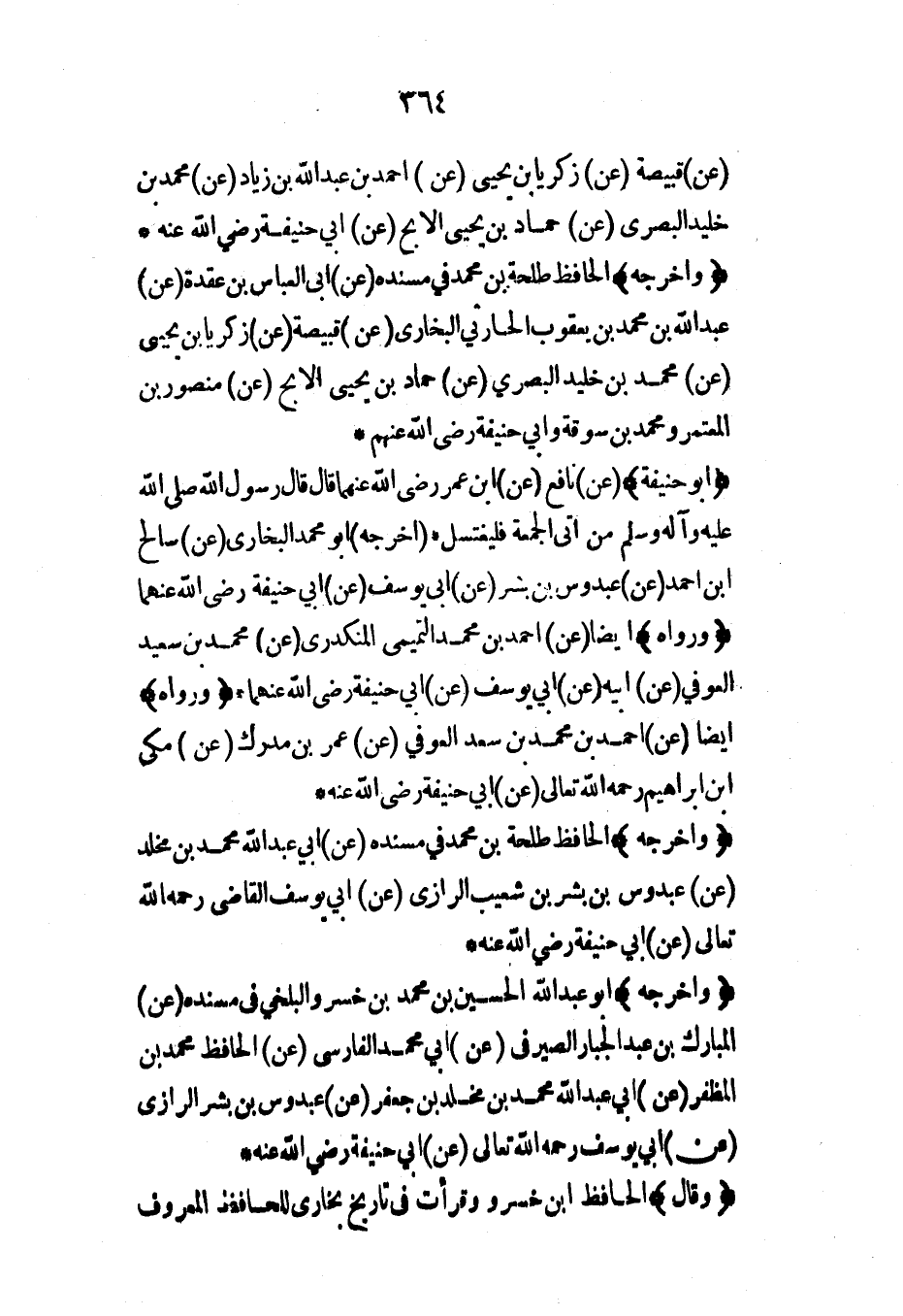 (أبو حنيفة) (عن) نافع (عن) ابن عمر رضي الله عنهما قال قال رسول الله صلى الله عليه وآله وسلم من أتى الجمعة فليغتسل* (أخرجه) أبو محمد البخاري (عن) صالح ابن أحمد (عن) عبدوس بن بشر (عن) أبي يوسف (عن) أبي حنيفة رضي الله عنهما (ورواه) أيضاً (عن) أحمد بن محمد التميمي المنكدري (عن) محمد بن سعيد العوفي (عن) أبيه (عن) أبي يوسف (عن) أبي حنيفة رضي الله عنهما* (ورواه) أيضاً (عن) أحمد بن محمد بن سعد العوفي (عن) عمر بن مدرك (عن) مكي ابن إبراهيم رحمه الله تعالى (عن) أبي حنيفة رضي الله عنه*