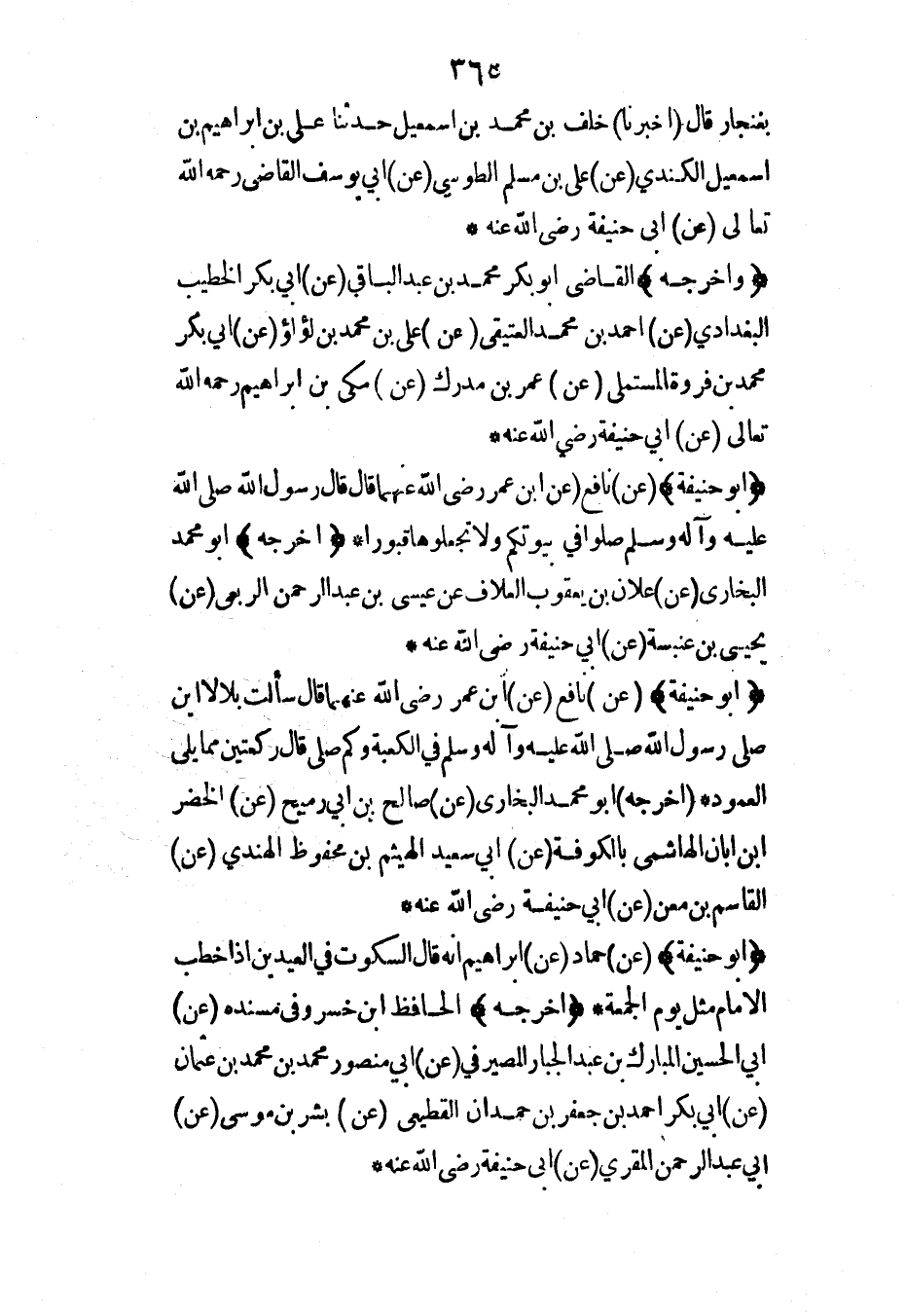 (أبو حنيفة) (عن) نافع (عن) ابن عمر رضي الله عنهما قال سألت بلالاً أين صلى رسول الله صلى الله عليه وآله وسلم في الكعبة وكم صلى قال ركعتين مما يلي العمود* (أخرجه) أبو محمد البخاري (عن) صالح بن أبي رميح (عن) الخضر ابن أبان الهاشمي بالكوفة (عن) أبي سعيد الهيثم بن محفوظ الهندي (عن) القاسم بن معن (عن) أبي حنيفة رضي الله عنه*