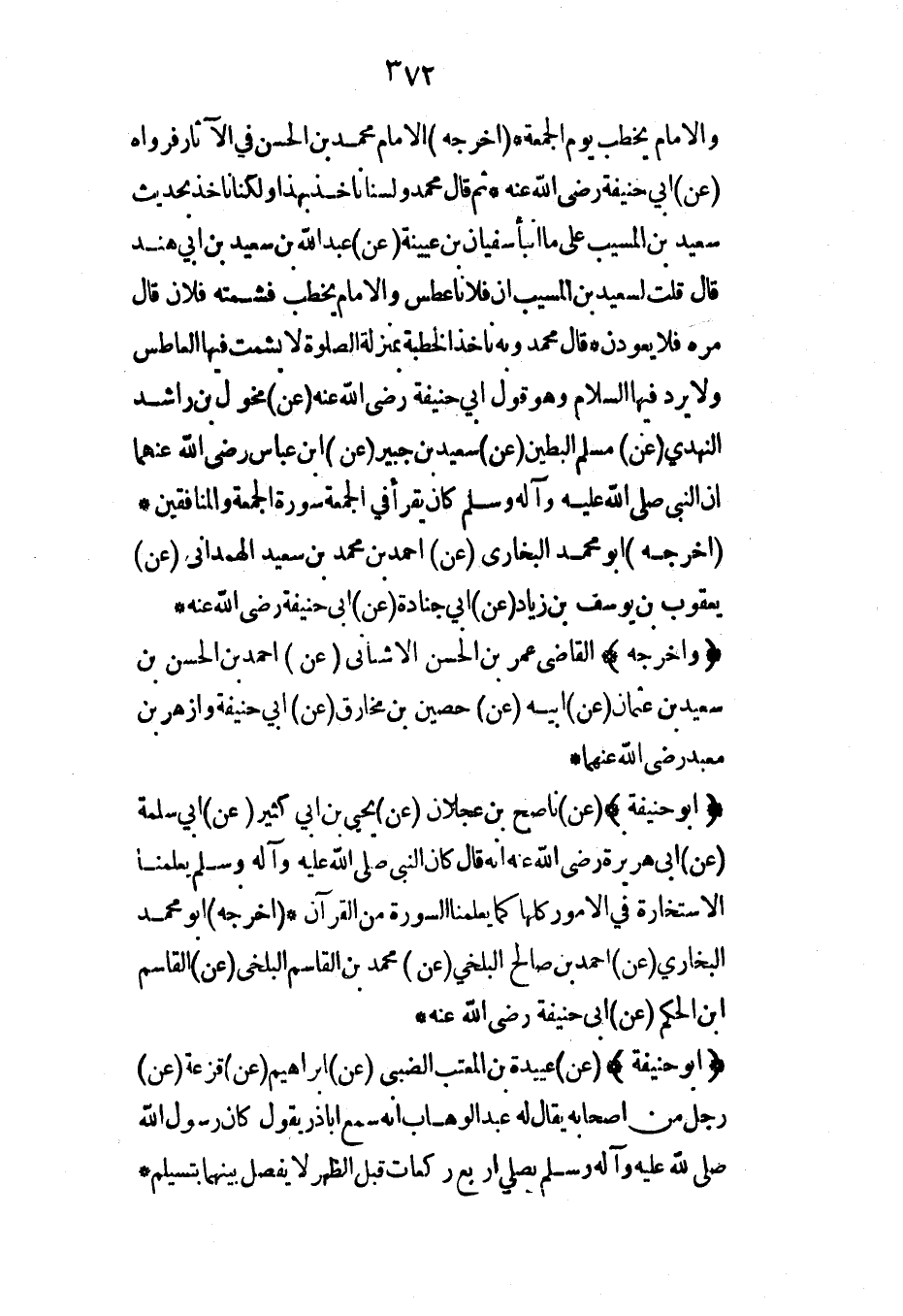 والإمام يخطب يوم الجمعة (أخرجه) الإمام محمد بن الحسن في الآثار فرواه (عن) أبي حنيفة رضي الله عنه* ثم قال محمد ولسنا نأخذ بهذا لكنا نأخذ بحديث سعيد بن المسيب على ما أنبأ سفيان بن عيينة (عن) عبد الله بن سعيد بن أبي هند قال قلت لسعيد بن المسيب أن فلاناً عطس والإمام يخطب فشمته فلان قال مرة فلا يعودن* قال محمد وبه نأخذ الخطبة بمنزلة الصلاة لا يشمت فيها العاطس ولا يرد فيها السلام وهو قول أبي حنيفة رضي الله عنه (عن) مخول بن راشد النهدي (عن) مسلم البطين (عن) سعيد بن جبير (عن) ابن عباس رضي الله عنهما أن النبي صلى الله عليه وآله وسلم كان يقرأ في الجمعة سورة الجمعة والمنافقين* (أخرجه) أبو محمد البخاري (عن) أحمد بن محمد بن سعيد الهمداني (عن) يعقوب بن يوسف بن زياد (عن) أبي جنادة (عن) أبي حنيفة رضي الله عنه*