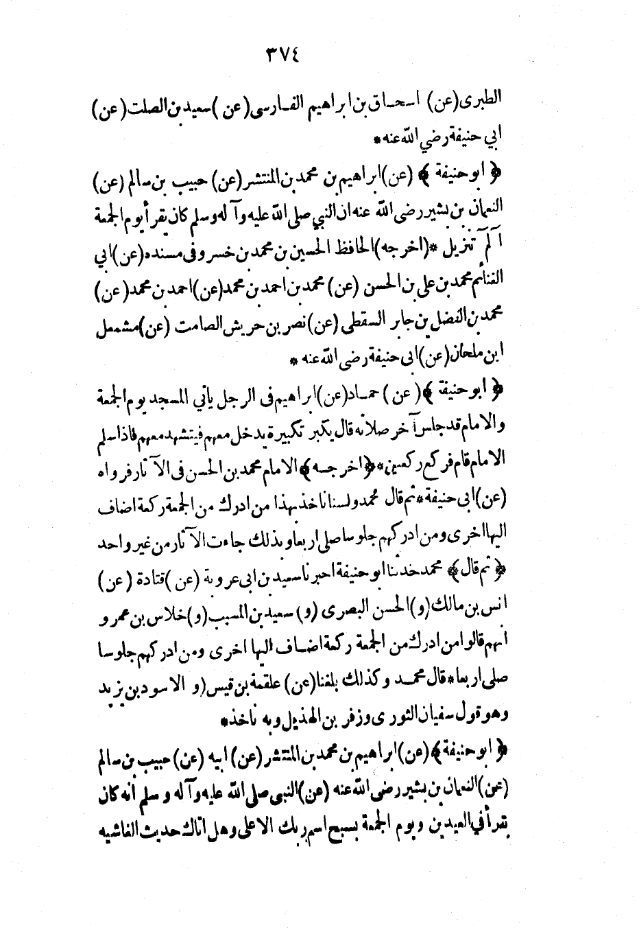 (أبو حنيفة) (عن) إبراهيم بن محمد بن المنتشر (عن) حبيب بن سالم (عن) النعمان بن بشير رضي الله عنه أن النبي صلى الله عليه وآله وسلم كان يقرأ يوم الجمعة آلم تنزيل* (أخرجه) الحافظ الحسين بن محمد بن خسرو في مسنده (عن) أبي الغنائم محمد بن علي بن الحسن (عن) محمد بن أحمد بن محمد (عن) أحمد بن محمد (عن) محمد بن الفضل بن جابر السقطي (عن) نصر بن حريش الصامت (عن) مشمعل ابن ملحان (عن) أبي حنيفة رضي الله عنه*