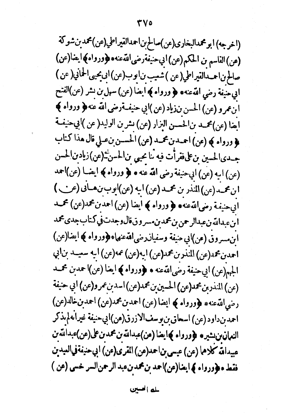 (أخرجه) أبو محمد البخاري (عن) صالح بن أحمد القيراطي (عن) محمد بن شوكة (عن) القاسم بن الحكم (عن) أبي حنيفة رضي الله عنه* (ورواه) أيضاً (عن) صالح بن أحمد القيراطي (عن) شعيب بن أيوب (عن) أبي يحيى الحماني (عن) أبي حنيفة رضي الله عنه* (ورواه) أيضاً (عن) سهل بن بشر (عن) الفتح ابن عمرو (عن) الحسن بن زياد (عن) أبي حنيفة رضي الله عنه (ورواه) أيضاً (عن) محمد بن الحسن البزار (عن) بشر بن الوليد (عن) أبي حنيفة (ورواه) (عن) أحمد بن محمد (عن) الحسن بن علي قال هذا كتاب جدي الحسين بن علي فقرأت فيه ثنا يحيى بن الحسن (عن) زياد بن الحسن (عن) أبيه (عن) أبي حنيفة رضي الله عنه* (ورواه) أيضاً (عن) أحمد ابن محمد (عن) المنذر بن محمد (عن) أبيه (عن) أيوب بن هاني (عن) أبي حنيفة رضي الله عنه* (ورواه) أيضاً (عن) أحمد بن محمد (عن) محمد ابن عبد الله بن عبد الرحمن بن محمد بن مسروق قال وجدت في كتاب جدي محمد ابن مسروق (عن) أبي حنيفة وسفيان رضي الله عنهما* (ورواه) أيضاً (عن) أحمد بن محمد (عن) المنذر بن محمد (عن) أبيه (عن) عمه (عن) أبيه سعيد بن أبي الجهم (عن) أبي حنيفة رضي الله عنه* (ورواه) أيضاً (عن) أحمد بن محمد (عن) المنذر بن محمد (عن) الحسين بن محمد (عن) أسد بن عمرو (عن) أبي حنيفة رضي الله عنه* (ورواه) أيضاً (عن) أحمد بن محمد (عن) أحمد بن خالد (عن) أحمد بن داود (عن) إسحاق بن يوسف الأزرق (عن) أبي حنيفة غير أنه لم يذكر النعمان بن بشير* (ورواه) أيضاً (عن) عبد الله بن محمد بن علي (عن) عبد الله بن عبيد الله كلاهما (عن) عيسى بن أحمد (عن) المقري (عن) أبي حنيفة في العيدين فقط* (ورواه) أيضاً (عن) أحمد بن محمد بن عبد الرحمن السرخسي (عن)