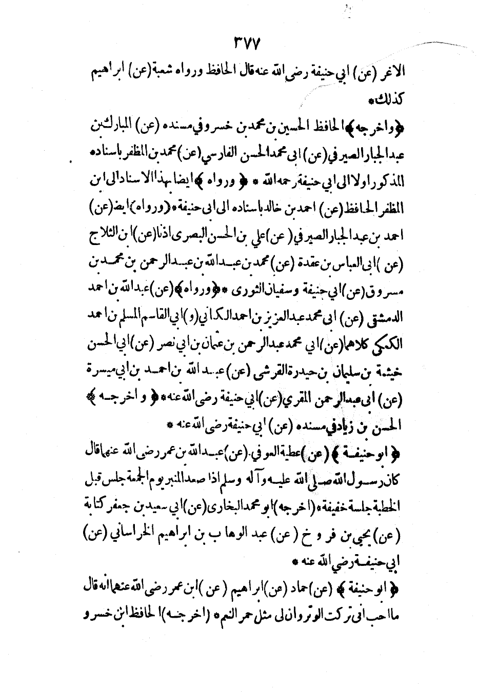 (وأخرجه) الحافظ الحسين بن محمد بن خسرو في مسنده (عن) المبارك بن عبد الجبار الصيرفي (عن) أبي محمد الحسن الفارسي (عن) محمد بن المظفر بإسناده المذكور أولاً إلى أبي حنيفة رحمه الله* (ورواه) أيضاً بهذا الإسناد إلى ابن المظفر الحافظ (عن) أحمد بن خالد بإسناده إلى أبي حنيفة* (ورواه) أيضاً (عن) أحمد بن عبد الجبار الصيرفي (عن) علي بن الحسن البصري إذناً (عن) ابن الثلاج (عن) أبي العباس بن عقدة (عن) محمد بن عبد الله بن عبد الرحمن بن محمد بن مسروق (عن) أبي حنيفة وسفيان الثوري* (ورواه) (عن) عبد الله بن أحمد الدمشقي (عن) أبي محمد عبد العزيز بن أحمد الكناني (و) أبي القاسم المسلم بن أحمد الكعكي كلاهما (عن) أبي محمد عبد الرحمن بن عثمان بن أبي نصر (عن) أبي الحسن خيثمة بن سليمان بن حيدرة القرشي (عن) عبد الله بن أحمد بن أبي ميسرة (عن) أبي عبد الرحمن المقري (عن) أبي حنيفة رضي الله عنه* (وأخرجه) الحسن بن زياد في مسنده (عن) أبي حنيفة رضي الله عنه*