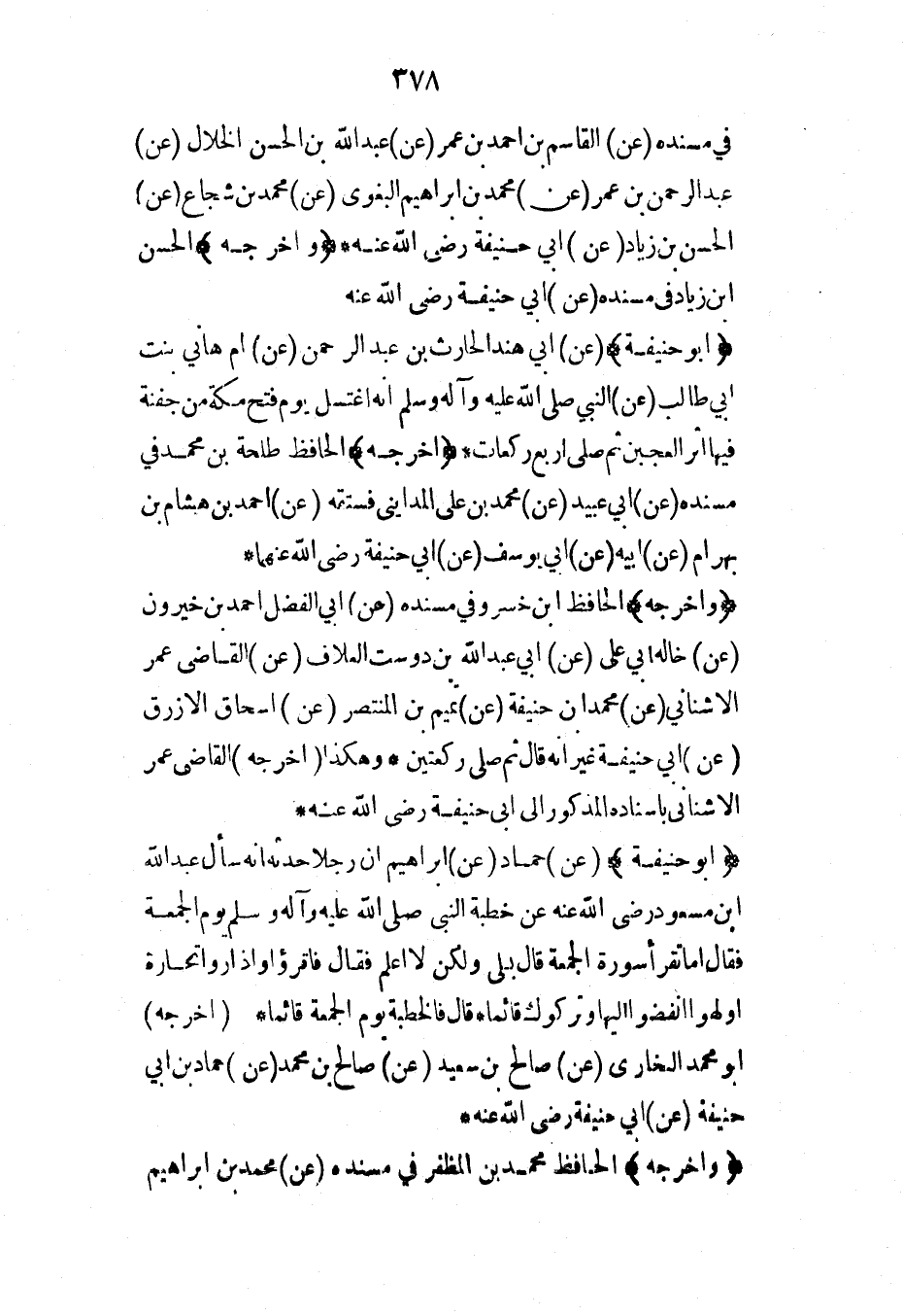 (أبو حنيفة) (عن) أبي هند الحارث بن عبد الرحمن (عن) أم هاني بنت أبي طالب (عن) النبي صلى الله عليه وآله وسلم أنه اغتسل يوم فتح مكة من جفنة فيها أثر العجين ثم صلى أربع ركعات* (أخرجه) الحافظ طلحة بن محمد في مسنده (عن) أبي عبيد (عن) محمد بن علي المدايني فستقه (عن) أحمد بن هشام بن بهرام (عن) أبيه (عن) أبي يوسف (عن) أبي حنيفة رضي الله عنهما*