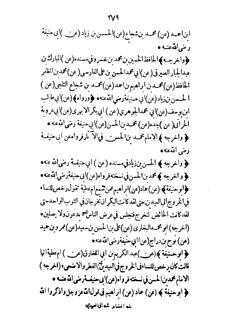 (أبو حنيفة) (عن) حماد (عن) إبراهيم عمن سمع أم عطية تقول رخص للنساء في الخروج إلى العيدين حتى لقد كانت البكران تخرجان في الثوب الواحد حتى لقد كانت الحائض لتخرج فتجلس في عرض الناس يدعون ولا يصلين* (أخرجه) أبو محمد البخاري (عن) علي بن الحسن بن سعيد (عن) عمرو بن حميد (عن) نوح بن دراج (عن) أبي حنيفة رضي الله عنه*