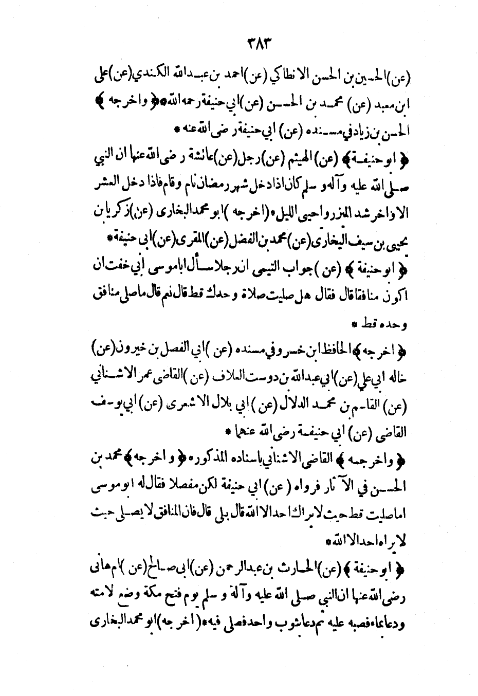 (أبو حنيفة) (عن) الهيثم (عن) رجل (عن) عائشة رضي الله عنها أن النبي صلى الله عليه وآله وسلم كان إذا دخل شهر رمضان نام وقام فإذا دخل العشر الأواخر شد الميزر وأحيى الليل* (أخرجه) أبو محمد البخاري (عن) زكريا بن يحيى بن سيف البخاري (عن) محمد بن الفضل (عن) المقري (عن) أبي حنيفة*
