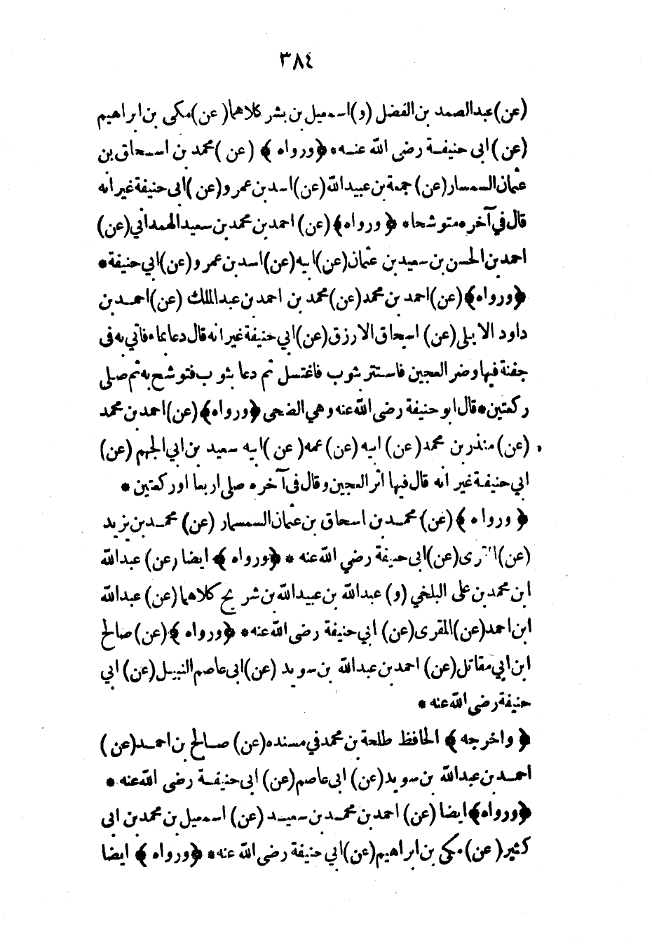 (عن) عبد الصمد بن الفضل (و) إسماعيل بن بشر كلاهما (عن) مكي بن إبراهيم (عن) أبي حنيفة رضي الله عنه* (ورواه) (عن) محمد بن إسحاق بن عثمان السمسار (عن) جمعة بن عبيد الله (عن) أسد بن عمرو (عن) أبي حنيفة غير أنه قال في آخره متوشحاً* (ورواه) (عن) أحمد بن محمد بن سعيد الهمداني (عن) أحمد بن الحسن بن سعيد بن عثمان (عن) أبيه (عن) أسد بن عمرو (عن) أبي حنيفة* (ورواه) (عن) أحمد بن محمد (عن) محمد بن أحمد بن عبد الملك (عن) أحمد بن داود الأيلي (عن) إسحاق الأزرق (عن) أبي حنيفة غير أنه قال دعا بماء فأتي به في جفنة فيها وضر العجين فاستتر بثوب فاغتسل ثم دعا بثوب فتوشح به ثم صلى ركعتين* قال أبو حنيفة رضي الله عنه وهي الضحى (ورواه) (عن) أحمد بن محمد (عن) منذر بن محمد (عن) أبيه (عن) عمه (عن) أبيه سعيد بن أبي الجهم (عن) أبي حنيفة غير أنه قال فيها أثر العجين وقال في آخره صلى أربعاً أو ركعتين*