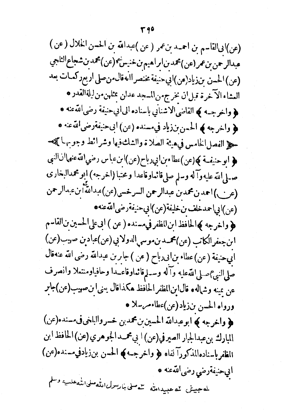 (عن) أبي القاسم بن أحمد بن عمر (عن) عبد الله بن الحسن الخلال (عن) عبد الرحمن بن عمر (عن) محمد بن إبراهيم بن خنيس (عن) محمد بن شجاع الثلجي (عن) الحسن بن زياد (عن) أبي حنيفة مختصراً أنه قال من صلى أربع ركعات بعد العشاء الآخرة قبل أن يخرج من المسجد عدلن بمثلهن من ليلة القدر*