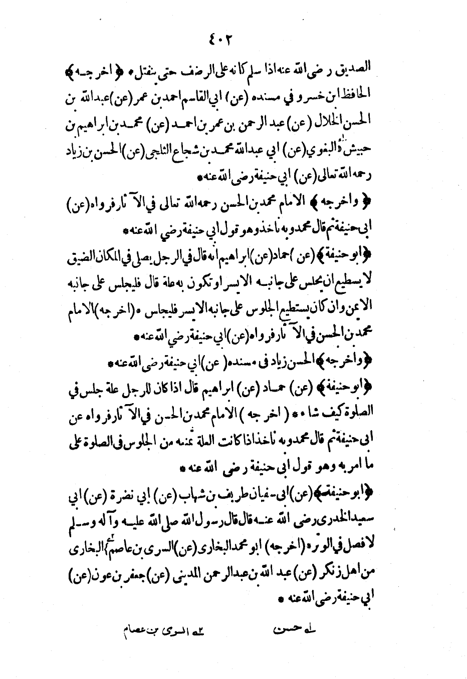 الصديق رضي الله عنه إذا سلم كأنه على الرضف حتى ينفتل* (أخرجه) الحافظ ابن خسرو في مسنده (عن) أبي القاسم أحمد بن عمر (عن) عبد الله بن الحسن الخلال (عن) عبد الرحمن بن عمر بن أحمد (عن) محمد بن إبراهيم بن حبيش البغوي (عن) أبي عبد الله محمد بن شجاع الثلجي (عن) الحسن بن زياد رحمه الله تعالى (عن) أبي حنيفة رضي الله عنه*