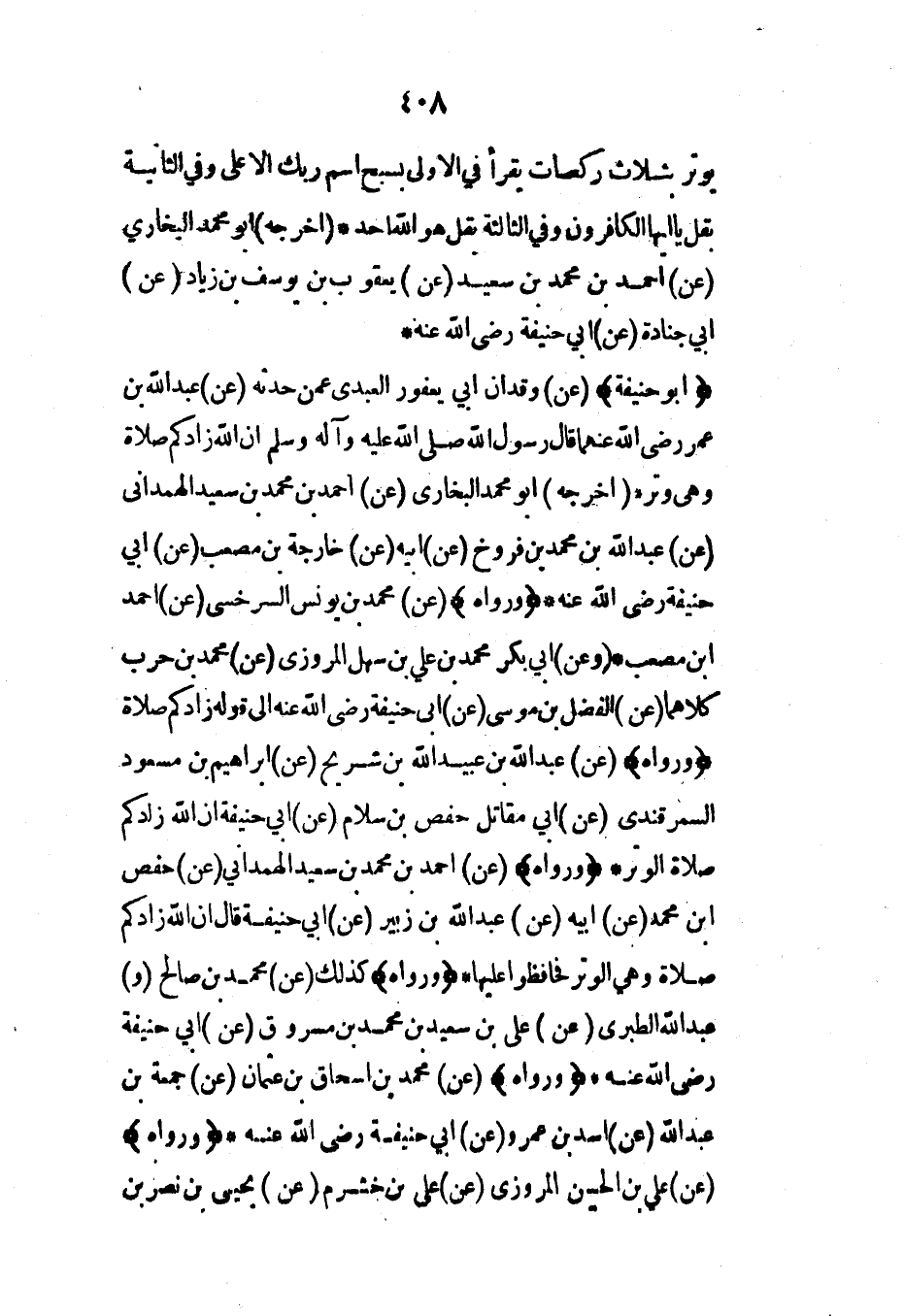 (أبو حنيفة) (عن) وقدان أبي يعفور العبدي عمن حدثه (عن) عبد الله بن عمر رضي الله عنهما قال رسول الله صلى الله عليه وآله وسلم أن الله زادكم صلاة وهي وتر* (أخرجه) أبو محمد البخاري (عن) أحمد بن محمد بن سعيد الهمداني (عن) عبد الله بن محمد بن فروخ (عن) أبيه (عن) خارجة بن مصعب (عن) أبي حنيفة رضي الله عنه* (ورواه) (عن) محمد بن يونس السرخسي (عن) أحمد ابن مصعب* (وعن) أبي بكر محمد بن علي بن سهل المروزي (عن) محمد بن حرب كلاهما (عن) الفضل بن موسى (عن) أبي حنيفة رضي الله عنه إلى قوله زادكم صلاة (ورواه) (عن) عبد الله بن عبيد الله بن شريح (عن) إبراهيم بن مسعود السمرقندي (عن) أبي مقاتل حفص بن سلام (عن) أبي حنيفة أن الله زادكم صلاة الوتر* (ورواه) (عن) أحمد بن محمد بن سعيد الهمداني (عن) حفص ابن محمد (عن) أبيه (عن) عبد الله بن زبير (عن) أبي حنيفة قال إن الله زادكم صلاة وهي الوتر فحافظوا عليها* (ورواه) كذلك (عن) محمد بن صالح (و) عبد الله الطبري (عن) علي بن سعيد بن محمد بن مسروق (عن) أبي حنيفة رضي الله عنه* (ورواه) (عن) محمد بن إسحاق بن عثمان (عن) جمعة بن عبد الله (عن) أسد بن عمرو (عن) أبي حنيفة رضي الله عنه* (ورواه) (عن) علي بن الحسن المروزي (عن) علي بن خشرم (عن) يحيى بن نصر بن