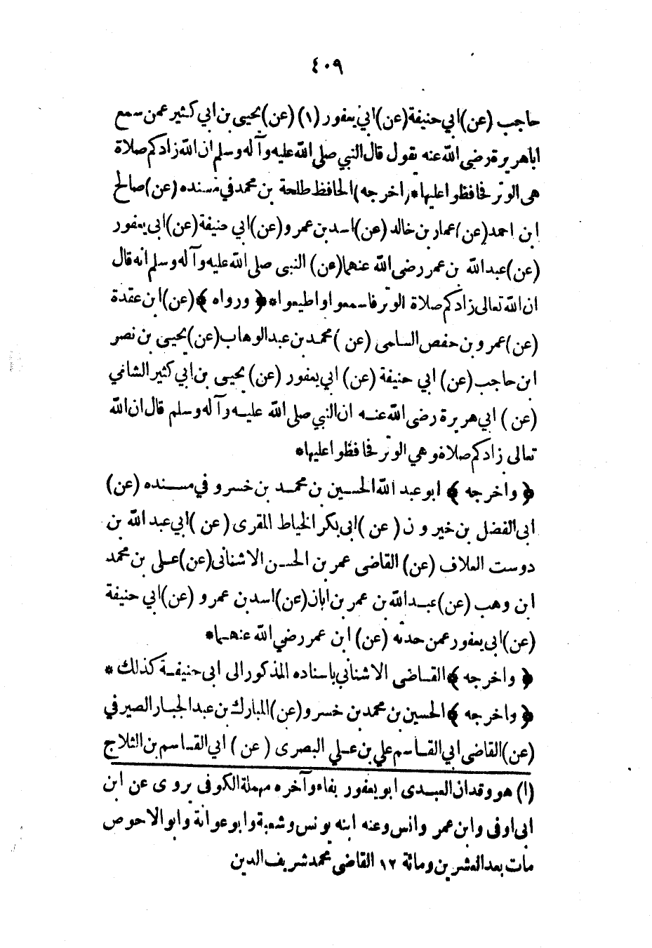 حاجب (عن) أبي حنيفة (عن) أبي يعفور (عن) يحيى بن أبي كثير عمن سمع أبا هريرة رضي الله عنه يقول قال النبي صلى الله عليه وآله وسلم أن الله زادكم صلاة هي الوتر فحافظوا عليها* (أخرجه) الحافظ طلحة بن محمد في مسنده (عن) صالح ابن أحمد (عن) عمار بن خالد (عن) أسد بن عمرو (عن) أبي حنيفة (عن) أبي يعفور (عن) عبد الله بن عمر رضي الله عنهما (عن) النبي صلى الله عليه وآله وسلم أنه قال أن الله تعالى زادكم صلاة الوتر فاسمعوا وأطيعوا* (ورواه) (عن) ابن عقدة (عن) عمرو بن حفص السلمي (عن) محمد بن عبد الوهاب (عن) يحيى بن نصر ابن حاجب (عن) أبي حنيفة (عن) أبي يعفور (عن) يحيى بن أبي كثير الشامي (عن) أبي هريرة رضي الله عنه أن النبي صلى الله عليه وآله وسلم قال أن الله تعالى زادكم صلاة وهي الوتر فحافظوا عليها*
