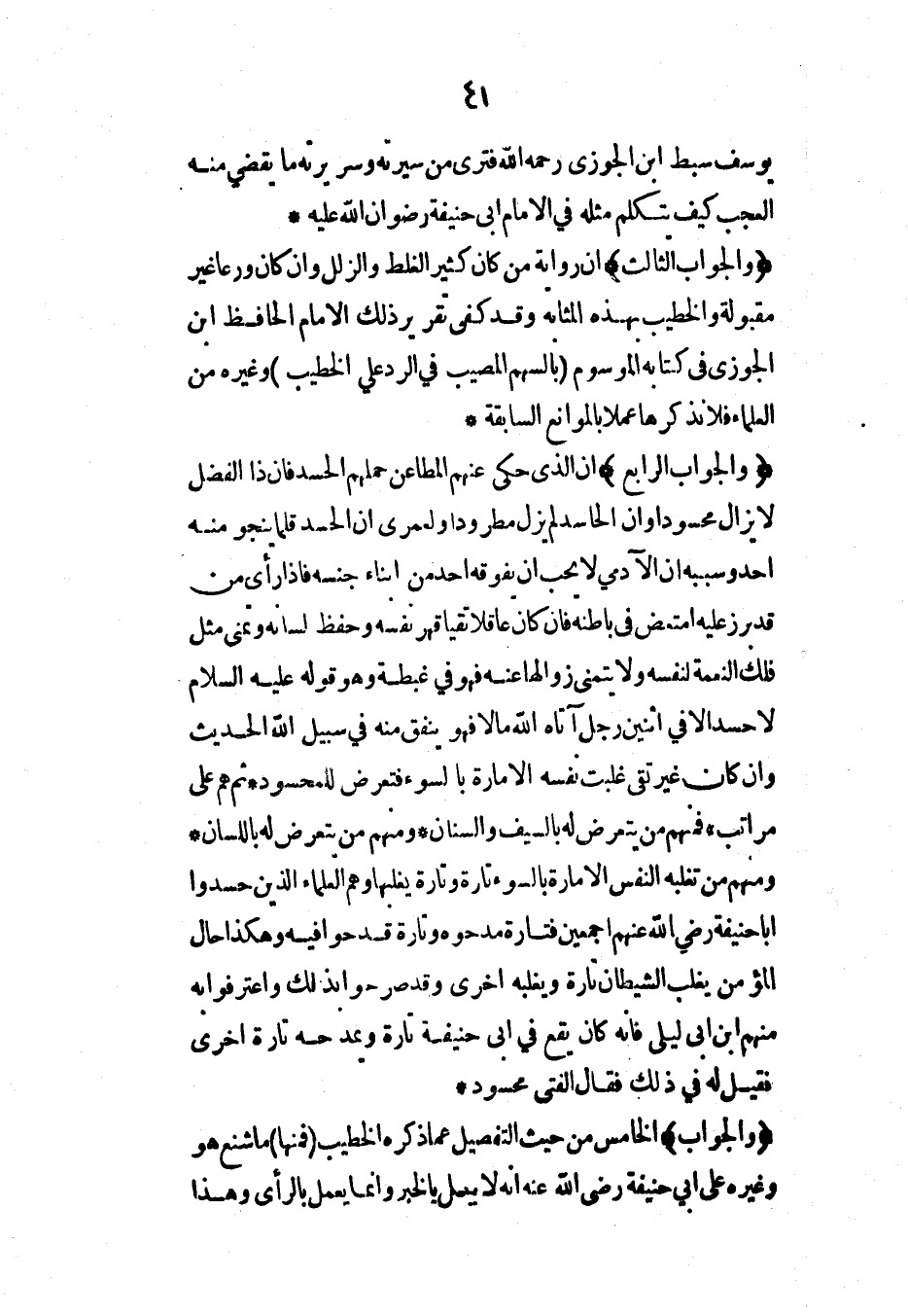 (والجواب الرابع) أن الذي حكى عنهم المطاعن حملهم الحسد فإن ذا الفضل لا يزال محسوداً وأن الحاسد لم يزل مطروداً ولعمري إن الحسد قلما ينجو منه أحد وسببه أن الآدمي لا يحب أن يفوقه أحد من أبناء جنسه فإذا رأى من قد برز عليه امتعض في باطنه فإن كان عاقلاً تقياً قهر نفسه وحفظ لسانه وتمنى مثل تلك النعمة لنفسه ولا يتمنى زوالها عنه فهو في غبطة وهو قوله عليه السلام لا حسد إلا في اثنين رجل آتاه الله مالاً فهو ينفق منه في سبيل الله الحديث وإن كان غير تقي غلبت نفسه الأمارة بالسوء فتعرض للمحسود* ثم هم على مراتب* فمنهم من يتعرض له بالسيف والسنان* ومنهم من يتعرض له باللسان* ومنهم من تغلبه النفس الأمارة بالسوء تارة وتارة يغلبها وهم العلماء الذين حسدوا أبا حنيفة رضي الله عنهم أجمعين فتارة مدحوه وتارة قدحوا فيه وهكذا حال المؤمن يغلب الشيطان تارة ويغلبه أخرى وقد صرحوا بذلك واعترفوا به منهم ابن أبي ليلى فإنه كان يقع في أبي حنيفة تارة ويمدحه تارة أخرى فقيل له في ذلك فقال الفتى محسود*