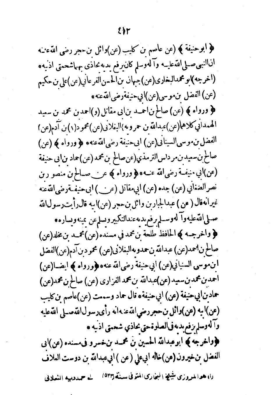 (ورواه) (عن) صالح بن أحمد بن أبي مقاتل (و) أحمد بن محمد بن سعيد الهمداني كلاهما (عن) عبد الله بن حمرويه البغلاني (عن) محمود بن آدم (عن) الفضل بن موسى السيناني (عن) أبي حنيفة رضي الله عنه* (ورواه) (عن) صالح بن سعيد بن مرداس الترمذي (عن) صالح بن محمد (عن) حماد بن أبي حنيفة (عن) أبي حنيفة رضي الله عنه* (ورواه) عن صالح بن منصور بن نصر الصغاني (عن) جده (عن) أبي مقاتل (عن) أبي حنيفة رضي الله عنه غير أنه قال (عن) عبد الجبار بن وائل بن حجر (عن) أبيه قال رأيت رسول الله صلى الله عليه وآله وسلم يرفع يديه عند التكبير ويسلم عن يمينه ويساره*