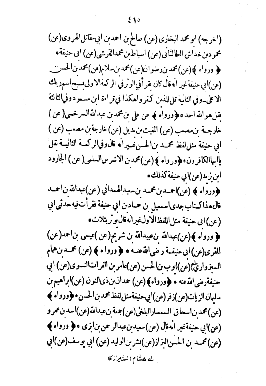 (أخرجه) أبو محمد البخاري (عن) صالح بن أحمد بن أبي مقاتل الهروي (عن) محمود بن خداش الطالقاني (عن) أسباط بن محمد القرشي (عن) أبي حنيفة* (ورواه) (عن) محمد بن رضوان (عن) محمد بن سلام (عن) محمد بن الحسن (عن) أبي حنيفة غير أنه قال كان يقرأ في الوتر في الركعة الأولى بـ {سبح اسم ربك الأعلى} وفي الثانية {قل للذين كفروا} هكذا في قراءة ابن مسعود وفي الثالثة بـ {قل هو الله أحد} * (ورواه) عن علي بن محمد بن عبد الله السرخسي (عن) خارجة بن مصعب (عن) المغيث بن بديل (عن) خارجة بن مصعب (عن) أبي حنيفة مثل لفظ محمد بن الحسن غير أنه قال وفي الركعة الثانية بـ {قل يأيها الكافرون} * (ورواه) (عن) محمد بن الأشرس السلمي (عن) الجارود ابن يزيد (عن) أبي حنيفة كذلك*