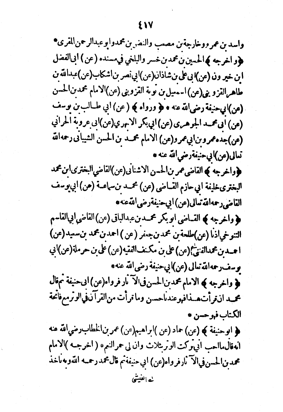 (وأخرجه) القاضي عمر بن الحسن الأشناني (عن) القاضي البختري ابن محمد البختري خليفة أبي حازم القاضي (عن) محمد بن سماعة (عن) أبي يوسف القاضي رحمه الله تعالى (عن) أبي حنيفة رضي الله عنه*