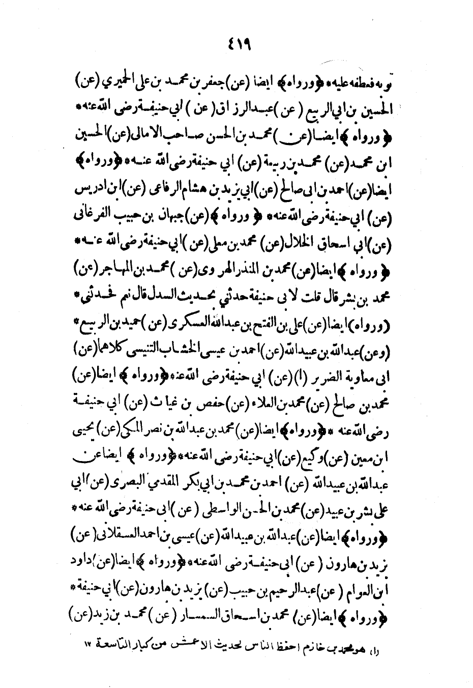 ثوبه فعطفه عليه* (ورواه) أيضاً (عن) جعفر بن محمد بن علي الحميري (عن) الحسين بن أبي الربيع (عن) عبد الرزاق (عن) أبي حنيفة رضي الله عنه* (ورواه) أيضاً (عن) محمد بن الحسن صاحب الأمالي (عن) الحسين ابن محمد (عن) محمد بن ربيعة (عن) أبي حنيفة رضي الله عنه* (ورواه) أيضاً (عن) أحمد بن أبي صالح (عن) أبي يزيد بن هشام الرفاعي (عن) ابن إدريس (عن) أبي حنيفة رضي الله عنه* (ورواه) (عن) جبهان بن حبيب الفرغاني (عن) أبي إسحاق الخلال (عن) محمد بن معلى (عن) أبي حنيفة رضي الله عنه* (ورواه) أيضاً (عن) محمد بن المنذر الهروي (عن) محمد بن المهاجر (عن) محمد بن بشر قال قلت لأبي حنيفة حدثني بحديث السدل قال نعم فحدثني* (ورواه) أيضاً (عن) علي بن الفتح بن عبد الله العسكري (عن) حميد بن الربيع* (وعن) عبد الله بن عبيد الله (عن) أحمد بن عيسى الخشاب التنيسي كلاهما (عن) أبي معاوية الضرير (عن) أبي حنيفة رضي الله عنه* (ورواه) أيضاً (عن) محمد بن صالح (عن) محمد بن العلاء (عن) حفص بن غياث (عن) أبي حنيفة رضي الله عنه* (ورواه) أيضاً (عن) محمد بن عبد الله بن نصر المكي (عن) يحيى ابن معين (عن) وكيع (عن) أبي حنيفة رضي الله عنه* (ورواه) أيضاً عن عبد الله بن عبيد الله (عن) أحمد بن محمد بن أبي بكر المقدمي البصري (عن) أبي علي بشر بن عبيد (عن) محمد بن الحسن الواسطي (عن) أبي حنيفة رضي الله عنه* (ورواه) أيضاً (عن) عبد الله بن عبيد الله (عن) عيسى بن أحمد العسقلاني (عن) يزيد بن هارون (عن) أبي حنيفة رضي الله عنه* (ورواه) أيضاً (عن) داود ابن العوام (عن) عبد الرحيم بن حبيب (عن) يزيد بن هارون (عن) أبي حنيفة* (ورواه) أيضاً (عن) محمد بن إسحاق السمسار (عن) محمد بن زيد (عن)