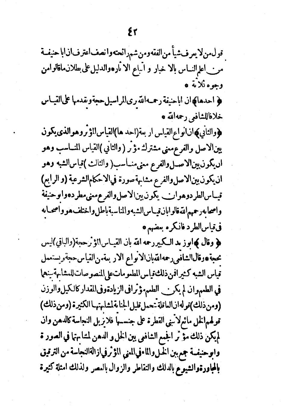(والثاني) أن أنواع القياس أربعة (أحدها) القياس المؤثر وهو الذي يكون بين الأصل والفرع معنى مشترك مؤثر (والثاني) القياس المناسب وهو أن يكون بين الأصل والفرع معنى مناسب (والثالث) قياس الشبه وهو أن يكون بين الأصل والفرع مشابهة صورة في الأحكام الشرعية (والرابع) قياس الطرد وهو أن يكون بين الأصل والفرع معنى مطرد* وأبو حنيفة وأصحابه رحمهم الله قالوا بأن قياس الشبه والمناسبة باطل واختلف هو وأصحابه في قياس الطرد فأنكره بعضهم*