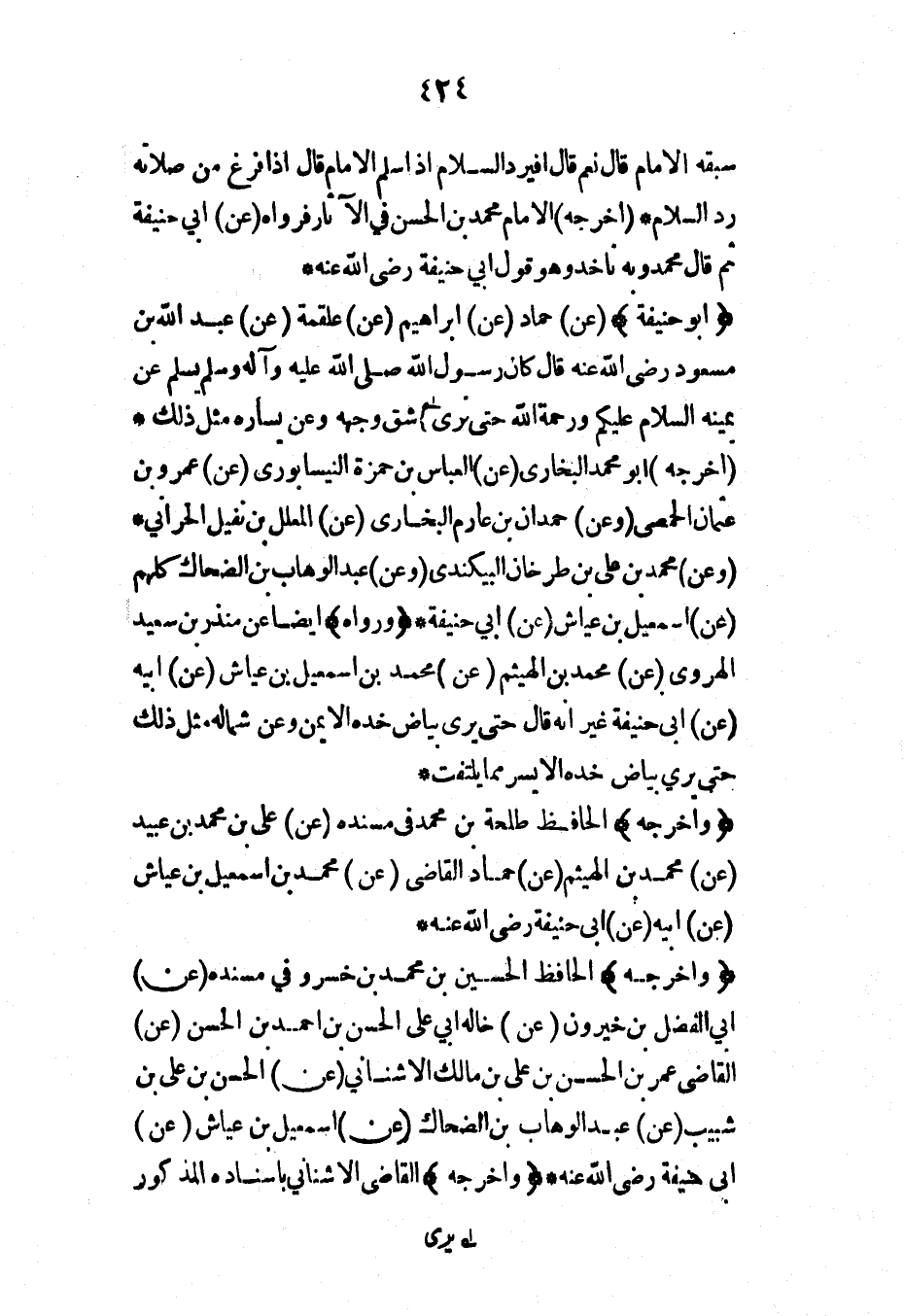 (أبو حنيفة) (عن) حماد (عن) إبراهيم (عن) علقمة (عن) عبد الله بن مسعود رضي الله عنه قال كان رسول الله صلى الله عليه وآله وسلم يسلم عن يمينه السلام عليكم ورحمة الله حتى نرى شق وجهه وعن يساره مثل ذلك* (أخرجه) أبو محمد البخاري (عن) العباس بن حمزة النيسابوري (عن) عمرو بن عثمان الحمصي (وعن) حمدان بن عارم البخاري (عن) المعلل بن نفيل الحراني* (وعن) محمد بن علي بن طرخان البيكندي (وعن) عبد الوهاب بن الضحاك كلهم (عن) إسماعيل بن عياش (عن) أبي حنيفة* (ورواه) أيضاً عن منذر بن سعيد الهروي (عن) محمد بن الهيثم (عن) محمد بن إسماعيل بن عياش (عن) أبيه (عن) أبي حنيفة غير أنه قال حتى يرى بياض خده الأيمن وعن شماله مثل ذلك حتى يرى بياض خذه الأيسر مما يلتفت*