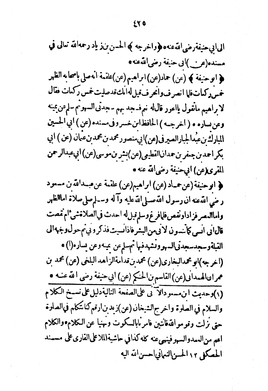 (أبو حنيفة) (عن) حماد (عن) إبراهيم (عن) علقمة أنه صلى بأصحابه الظهر خمس ركعات فلما انصرف وانحرف قيل له إنك قد صليت خمس ركعات فقال لإبراهيم ما تقول يا أعور قال له نعم فسجد بهم سجدتي السهو ثم سلم عن يمينه وعن يساره* (أخرجه) الحافظ ابن خسرو في مسنده (عن) أبي الحسين المبارك بن عبد الجبار الصيرفي (عن) أبي منصور محمد بن محمد بن عثمان (عن) أبي بكر أحمد بن جعفر بن حمدان القطيعي (عن) بشر بن موسى (عن) أبي عبد الرحمن المقري (عن) أبي حنيفة رضي الله عنه*