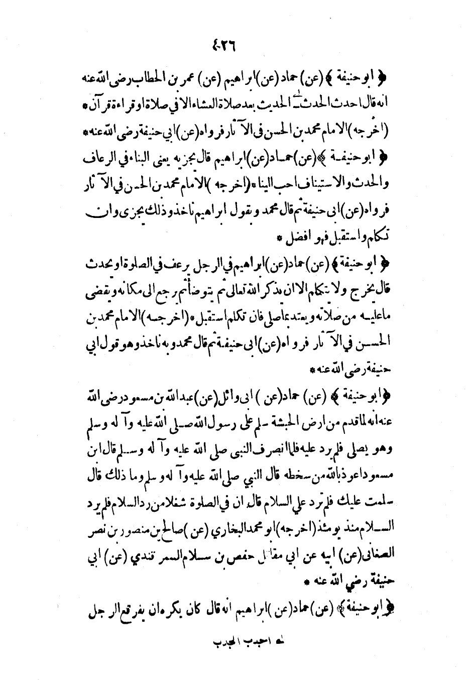 (أبو حنيفة) (عن) حماد (عن) أبي وائل (عن) عبد الله بن مسعود رضي الله عنه أنه لما قدم من أرض الحبشة سلم على رسول الله صلى الله عليه وآله وسلم وهو يصلي فلم يرد عليه فلما انصرف النبي صلى الله عليه وآله وسلم قال ابن مسعود أعوذ بالله من سخطه قال النبي صلى الله عليه وآله وسلم وما ذلك قال سلمت عليك فلم ترد علي السلام قال إن في الصلاة شغلاً من رد السلام فلم يرد السلام منذ يومئذ (أخرجه) أبو محمد البخاري (عن) صالح بن منصور بن نصر الصغاني (عن) أبيه عن أبي مقاتل حفص بن سلام السمرقندي (عن) أبي حنيفة رضي الله عنه*