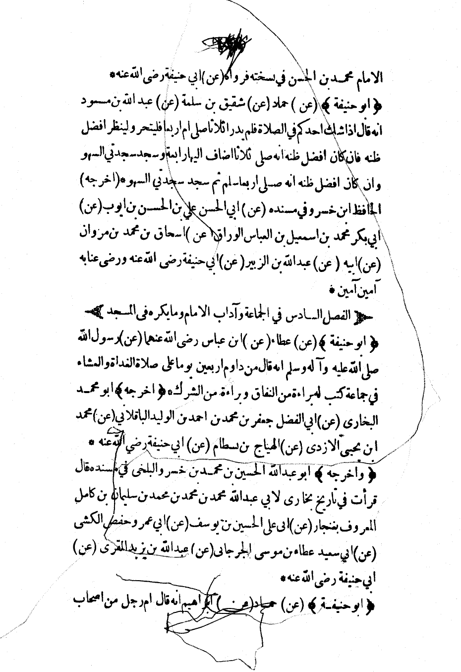 (أبو حنيفة) (عن) حماد (عن) شقيق بن سلمة (عن) عبد الله بن مسعود أنه قال إذا شك أحدكم في الصلاة فلم يدر أثلاثاً صلى أم أربعاً فليتحر ولينظر أفضل ظنه فإن كان أفضل ظنه أنه صلى ثلاثاً أضاف إليها رابعة وسجد سجدتي السهو وإن كان أفضل ظنه أنه صلى أربعاً سلم ثم سجد سجدتي السهو* (أخرجه) الحافظ ابن خسرو في مسنده (عن) أبي الحسن علي بن الحسن بن أيوب (عن) أبي بكر محمد بن إسماعيل بن العباس الوراق (عن) إسحاق بن محمد بن مروان (عن) أبيه (عن) عبد الله بن الزبير (عن) أبي حنيفة رضي الله عنه ورضي عنا به آمين آمين*