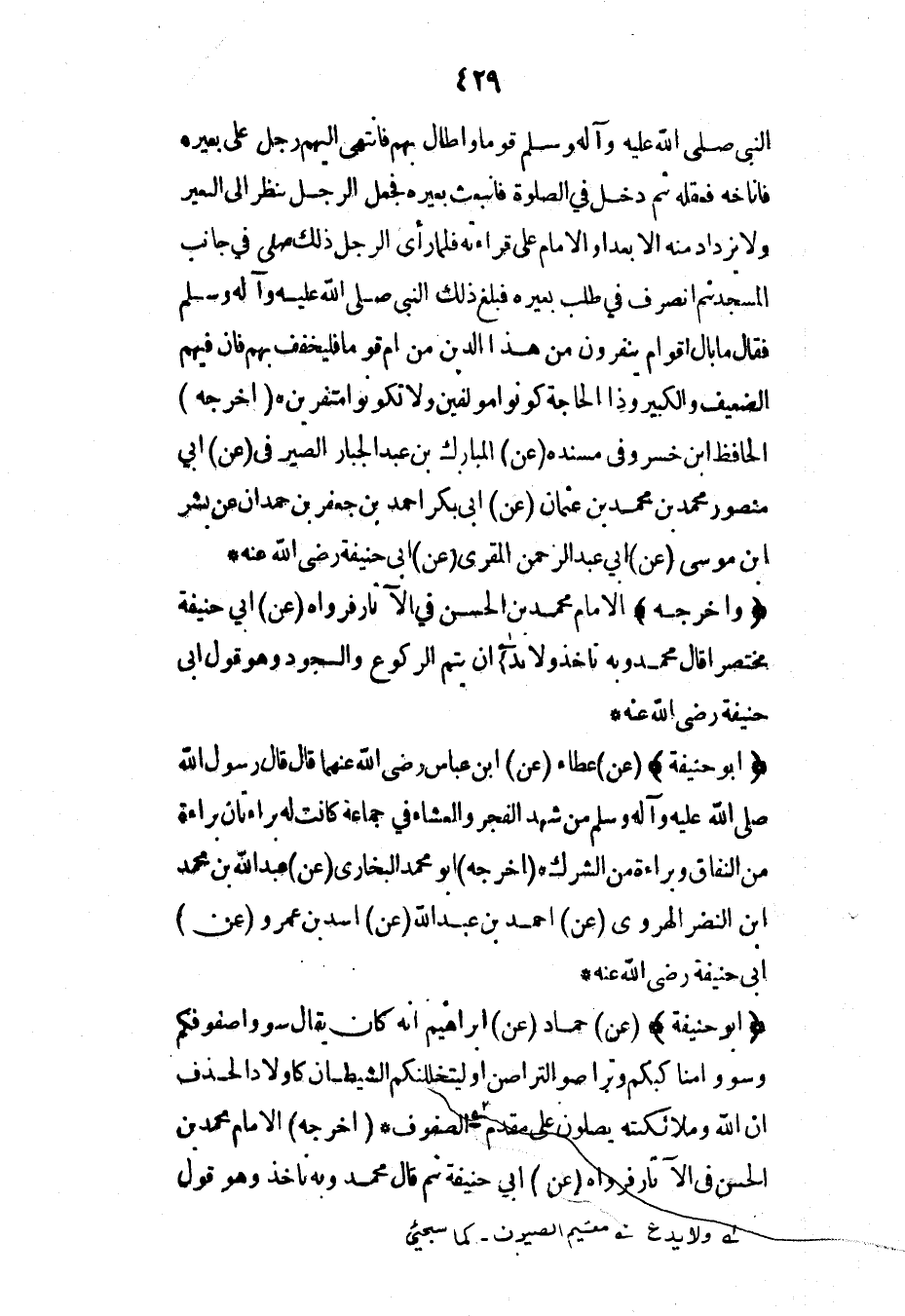 النبي صلى الله عليه وآله وسلم قوماً وأطال بهم فانتهى إليهم رجل على بعيره فأناخه فعقله ثم دخل في الصلاة فانبعث بعيره فجعل الرجل ينظر إلى البعير ولا يزداد منه إلا بعداً والإمام على قراءته فلما رأى الرجل ذلك صلى في جانب المسجد ثم انصرف في طلب بعيره فبلغ ذلك النبي صلى الله عليه وآله وسلم فقال ما بال أقوام ينفرون من هذا الدين من أم قوماً فليخفف بهم فإن فيهم الضعيف والكبير وذا الحاجة كونوا مؤلفين ولا تكونوا متنفرين* (أخرجه) الحافظ ابن خسرو في مسنده (عن) المبارك بن عبد الجبار الصيرفي (عن) أبي منصور محمد بن محمد بن عثمان (عن) أبي بكر أحمد بن جعفر بن حمدان عن بشر ابن موسى (عن) أبي عبد الرحمن المقري (عن) أبي حنيفة رضي الله عنه*