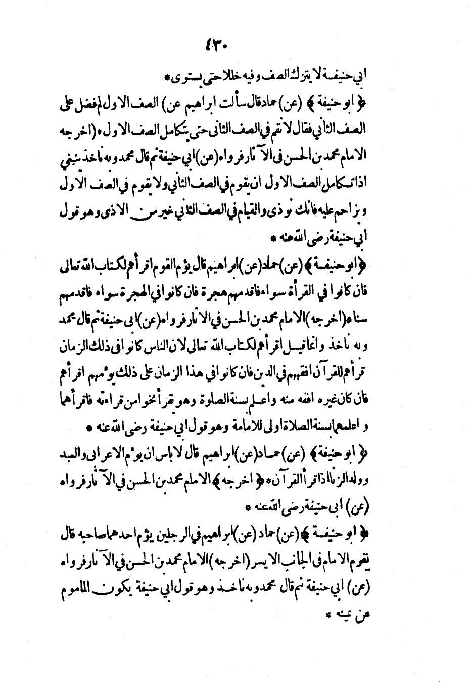 (أبو حنيفة) (عن) حماد قال سألت إبراهيم (عن) الصف الأول لم فضل على الصف الثاني فقال لا تقم في الصف الثاني حتى يتكامل الصف الأول* (أخرجه) الإمام محمد بن الحسن في الآثار فرواه (عن) أبي حنيفة ثم قال محمد وبه نأخذ ينبغي إذا تكامل الصف الأول أن يقوم في الصف الثاني ولا يقوم في الصف الأول ويزاحم عليه فإنك تؤذي والقيام في الصف الثاني خير من الأذى وهو قول أبي حنيفة رضي الله عنه*