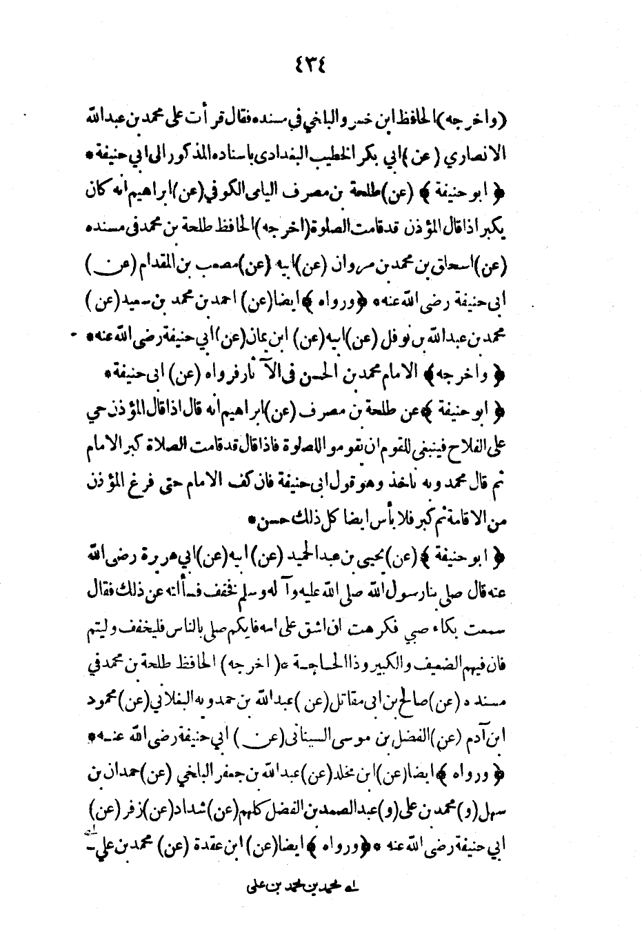 (أبو حنيفة) (عن) طلحة بن مصرف اليامي الكوفي (عن) إبراهيم أنه كان يكبر إذا قال المؤذن قد قامت الصلاة (أخرجه) الحافظ طلحة بن محمد في مسنده (عن) إسحاق بن محمد بن مروان (عن) أبيه (عن) مصعب بن المقدام (عن) أبي حنيفة رضي الله عنه* (ورواه) أيضاً (عن) أحمد بن محمد بن سعيد (عن) محمد بن عبد الله بن نوفل (عن) أبيه (عن) ابن يمان (عن) أبي حنيفة رضي الله عنه* (وأخرجه) الإمام محمد بن الحسن في الآثار فرواه (عن) أبي حنيفة*