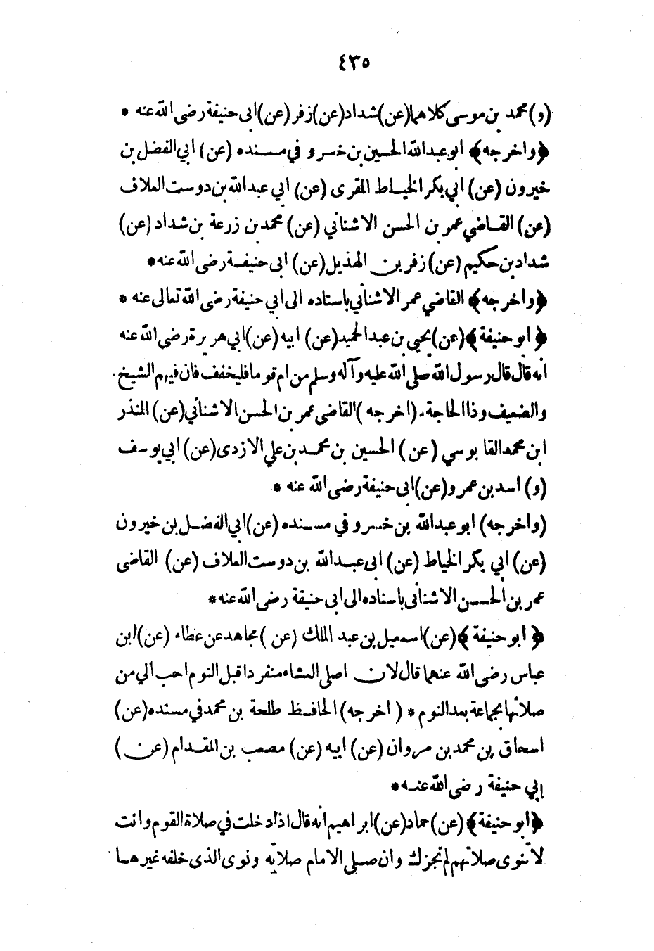 (وأخرجه) أبو عبد الله بن خسرو في مسنده (عن) أبي الفضل بن خيرون (عن) أبي بكر الخياط (عن) أبي عبد الله بن دوست العلاف (عن) القاضي عمر بن الحسن الأشناني بإسناده إلى أبي حنيفة رضي الله عنه*