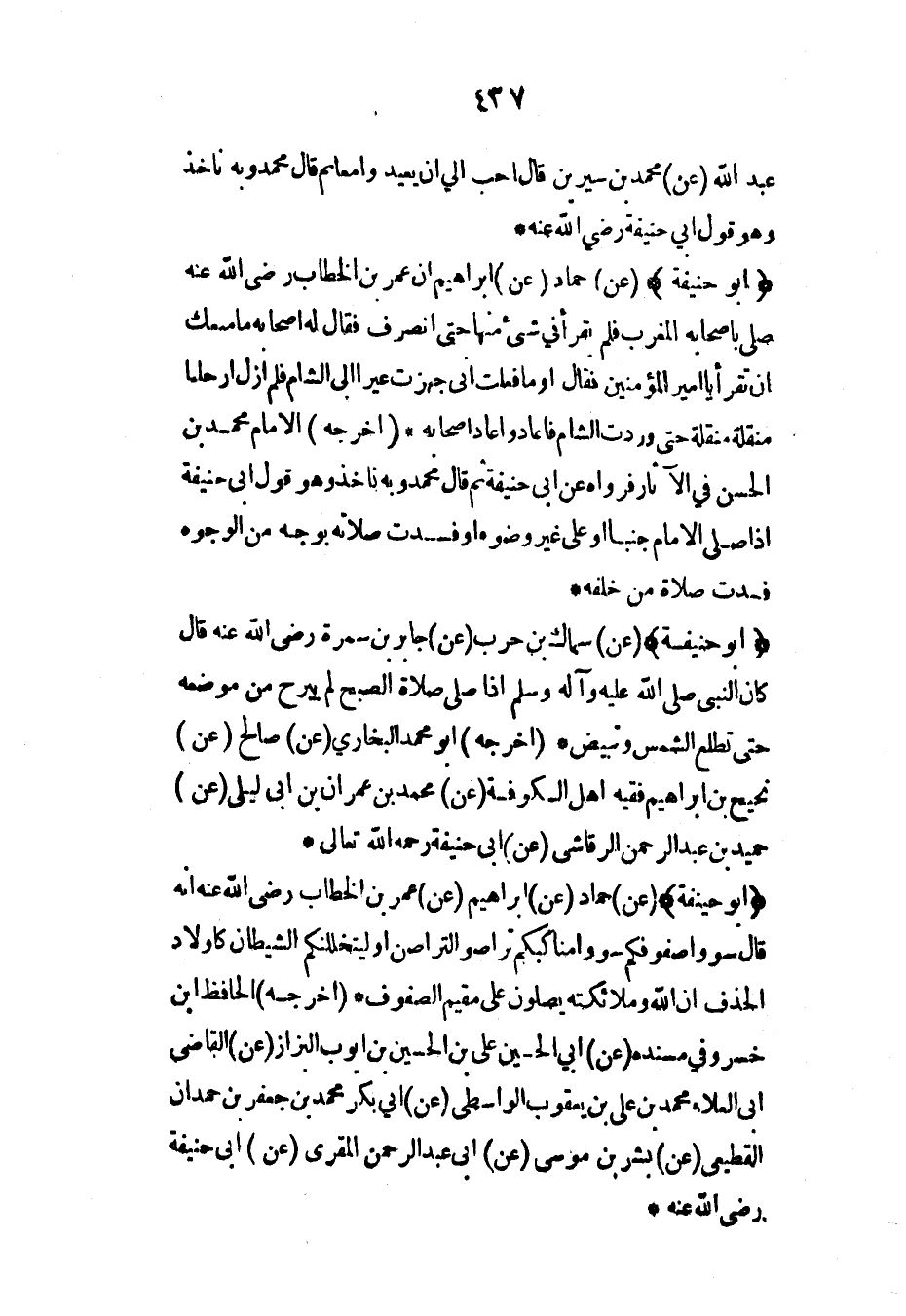 (أبو حنيفة) (عن) سماك بن حرب (عن) جابر بن سمرة رضي الله عنه قال كان النبي صلى الله عليه وآله وسلم إذا صلى صلاة الصبح لم يبرح من موضعه حتى تطلع الشمس وتبيض* (أخرجه) أبو محمد البخاري (عن) صالح (عن) نجيح بن إبراهيم فقيه أهل الكوفة (عن) محمد بن عمران بن أبي ليلى (عن) حميد بن عبد الرحمن الرقاشي (عن) أبي حنيفة رحمه الله تعالى*